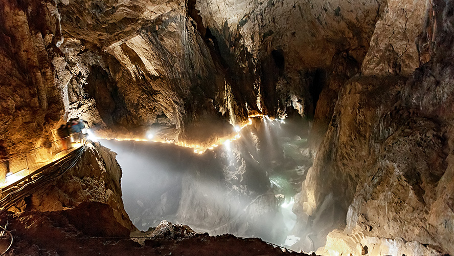 A medida que avanzas, el paisaje se transforma al entrar en la cueva Šumeča Jama (Cueva Murmurante), donde el río Reka toma protagonismo. Este río subterráneo, que serpentea a lo largo de las galerías, es responsable de la creación del imponente cañón subterráneo que define a Škocjan. Cruzar el puente Cerkvenik, suspendido a más de 50 metros sobre el río, es uno de los momentos más memorables de la visita, ofreciendo vistas que combinan la inmensidad de la cueva con el poder del agua.