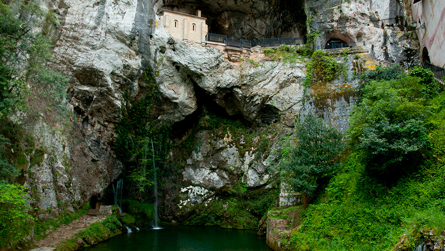 Enseguida descubriremos en qué lugar se encuentra la Santa Cueva o santuario de Covadonga porque a sus pies existe una cascada o chorrón que forma una poza. Junto a ella, veremos la fuente de los Siete Caños o “fuente del Matrimonio”, porque, según la creencia popular, las jóvenes que beben –“sin respirar”– de su agua se casan en menos de un año. Al menos es lo que dice la copla: “La Virgen de Covadonga/ tiene una fuente muy clara;/ la niña que beba en ella/ dentro del año se casa”.