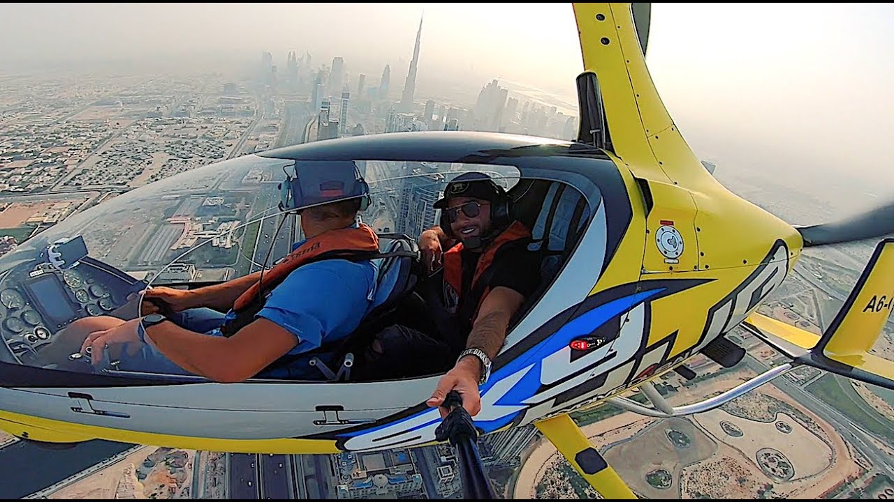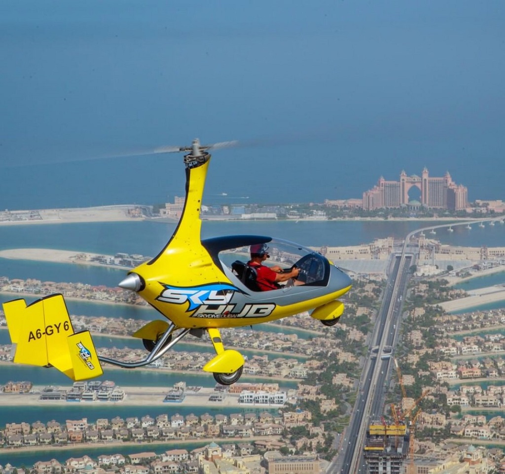 Discover the exhilarating experiences offered by Skyhub's Gyrocopter, a two-seat aircraft providing a unique flying adventure at 1,500 ft. Accompanied by our skilled pilots, you'll embark on a journey along Dubai Marina's coastline, passing iconic landmarks such as the Dubai Eye, Palm Jumeirah, Atlantis Hotel, World Islands, and the majestic Burj Al Arab.