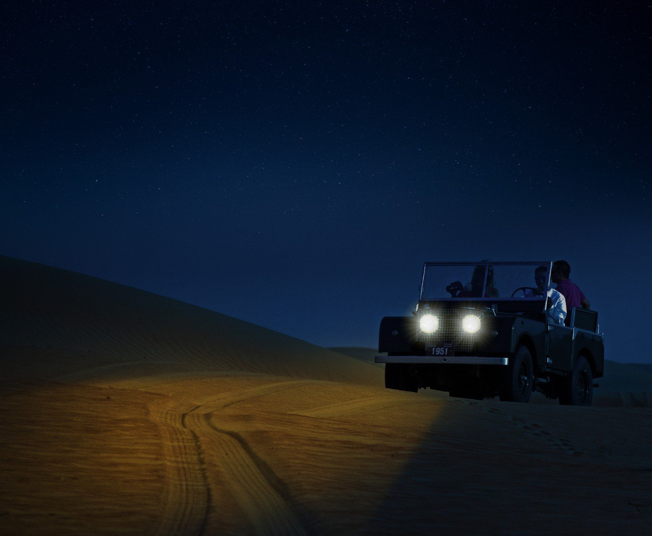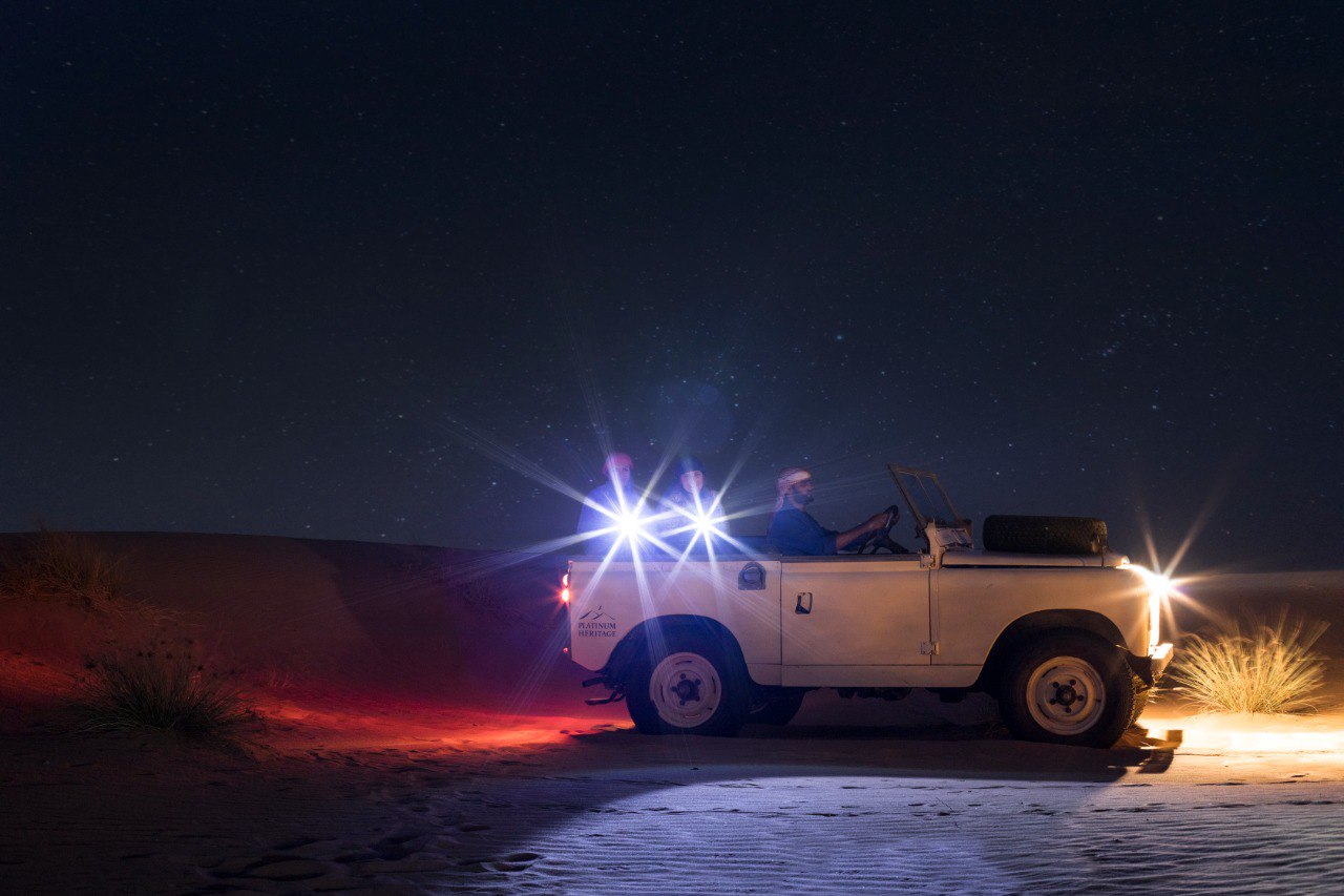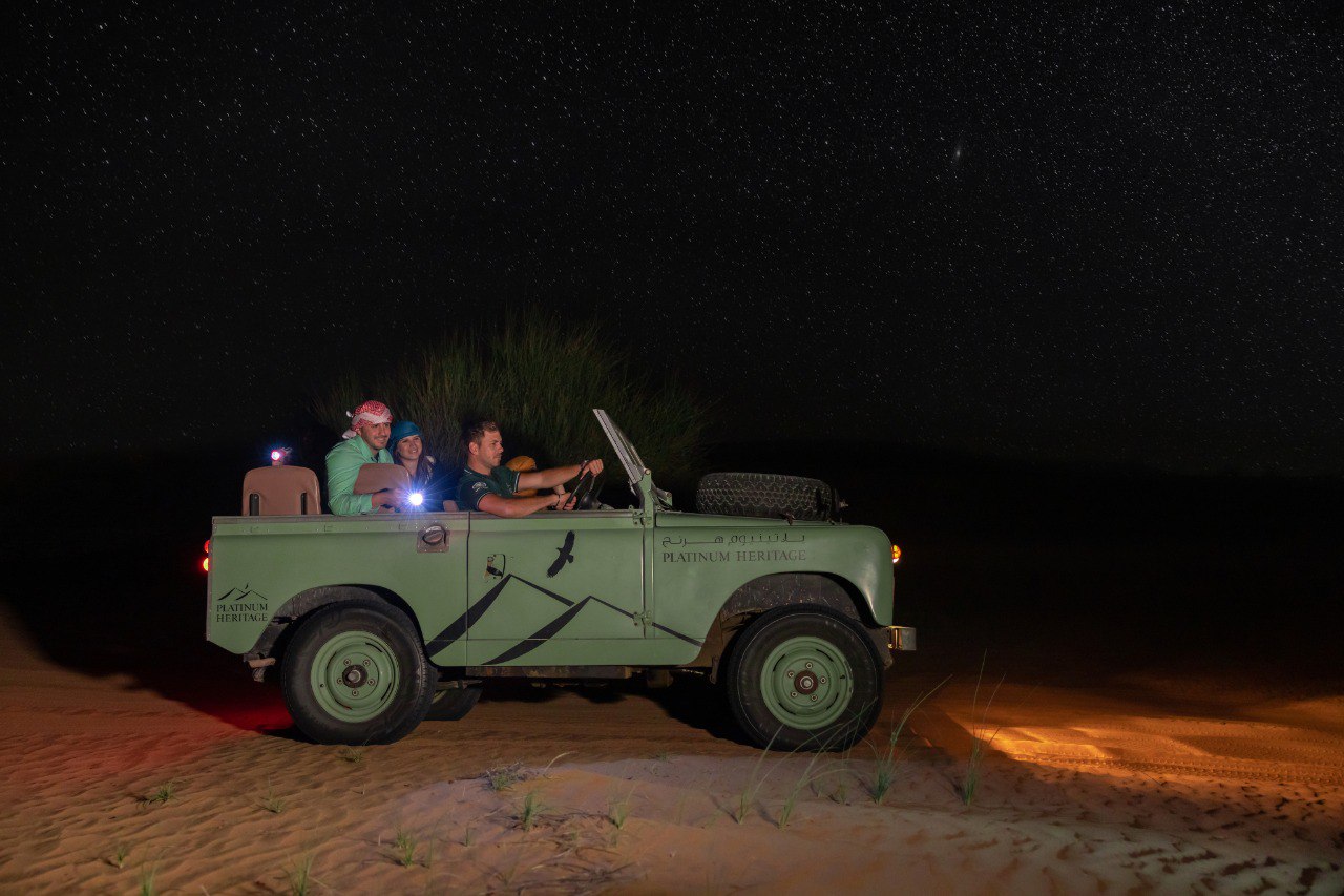 Embark through Dubai Desert Conservation Reserve in an open-top vintage Land Rover spotting nocturnal wildlife.