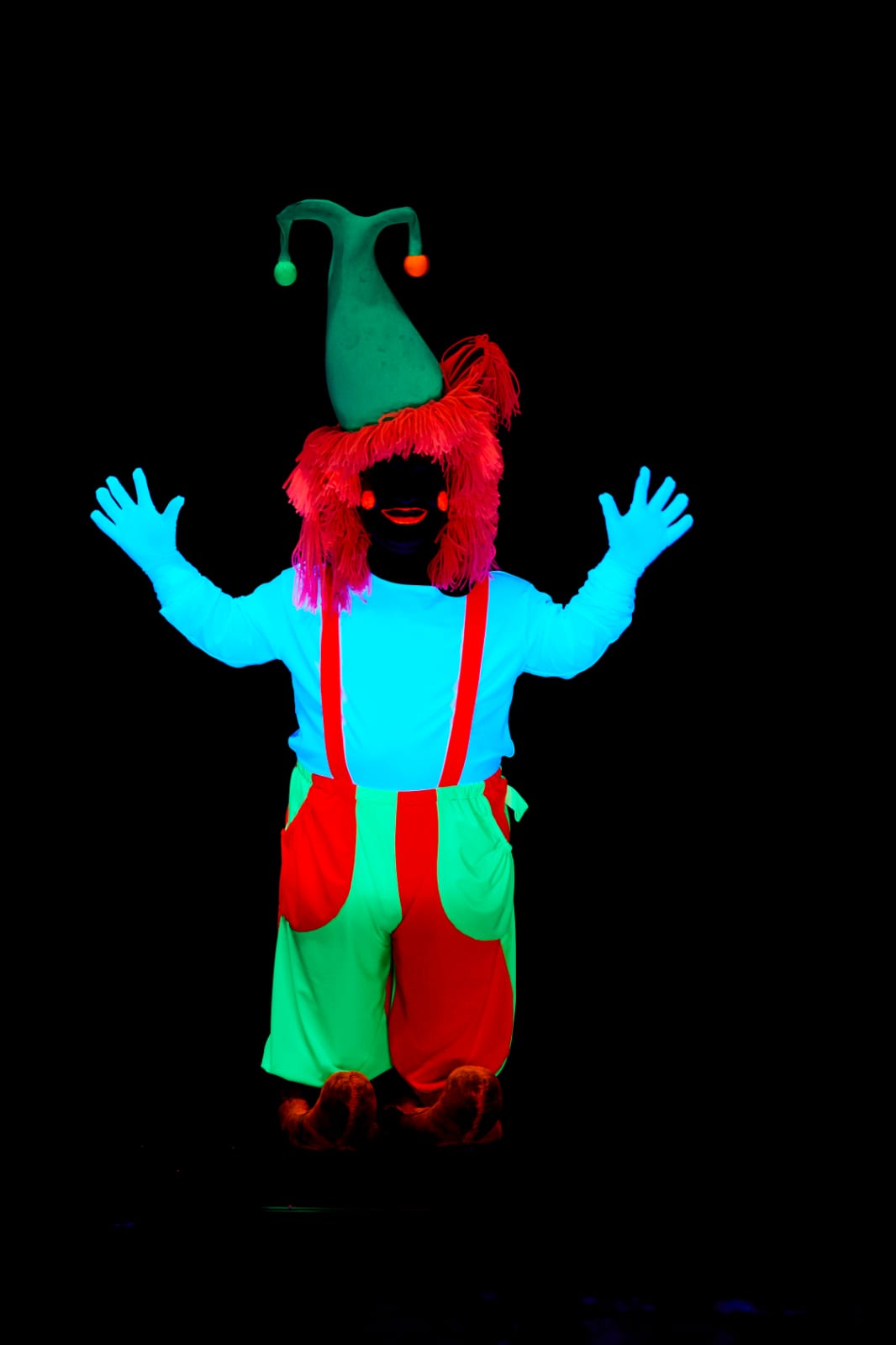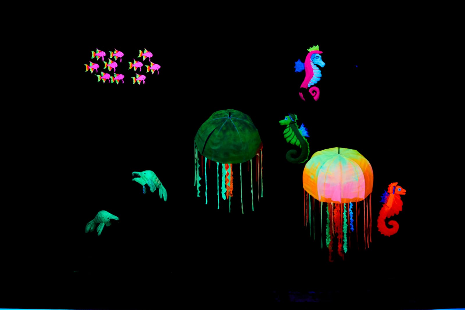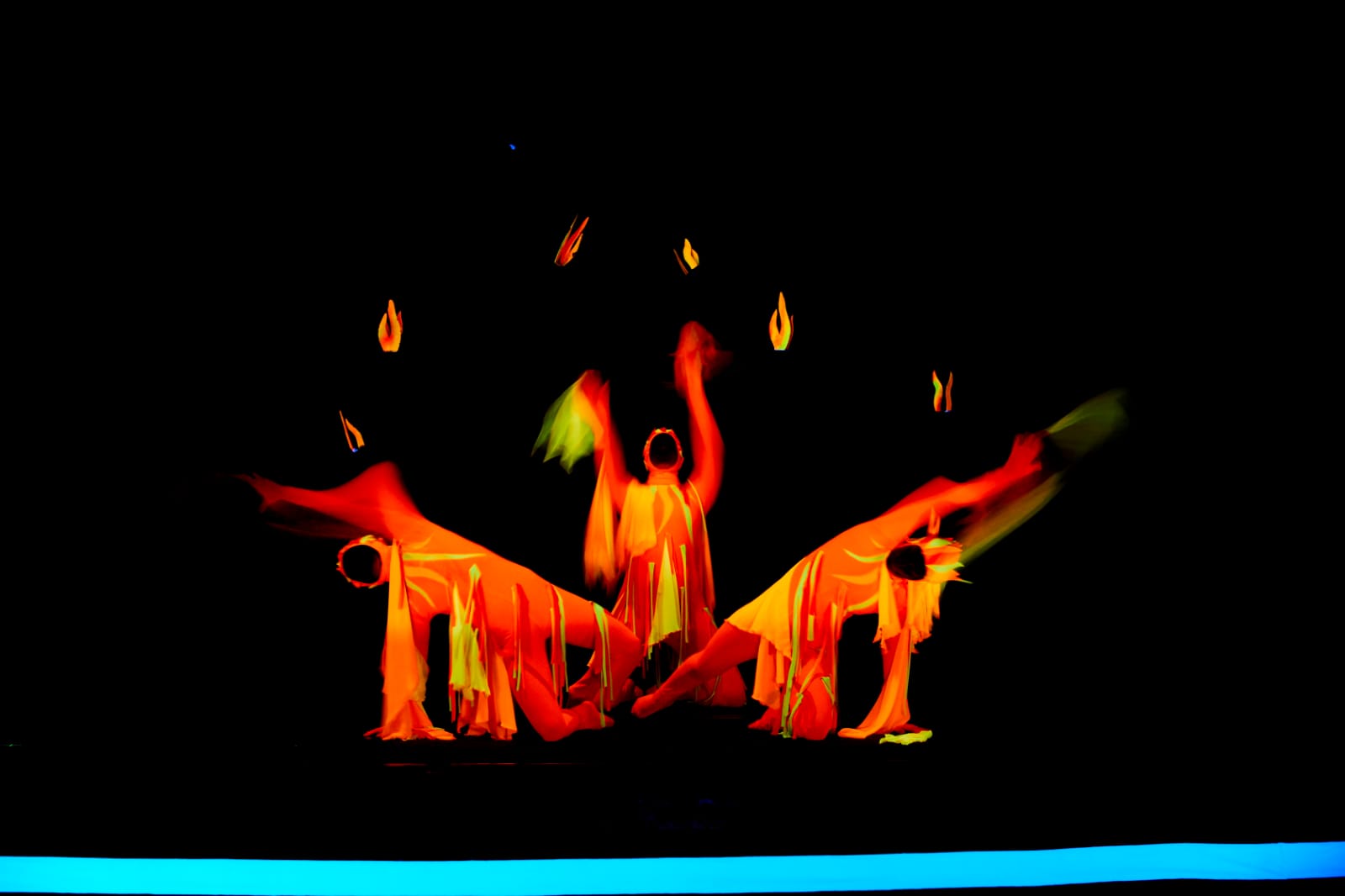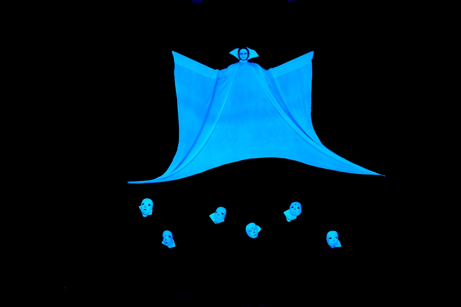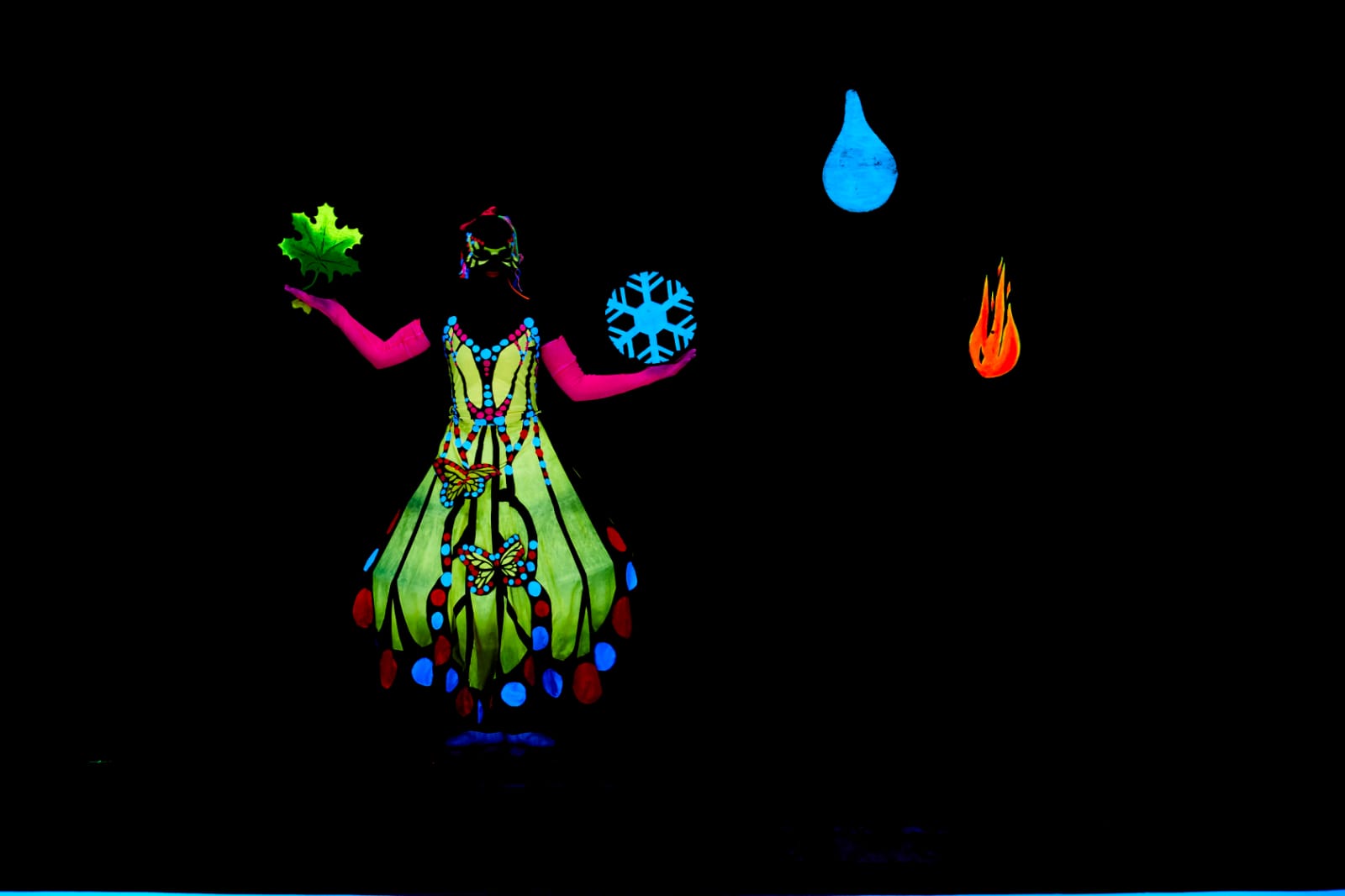 Black light theatre originated in ancient China. The first black light theatre performance was created for the emperor’s entertainment. Its magical attractiveness has been based on a simple secret – the dark itself. The actors dress in black costumes and wear black gloves and masks. The fluorescent lights highlighting the objects painted with fluorescent dye are the building blocks of this optical illusion. The actors move objects painted in fluorescent dye so that it seems like these objects are floating in the air.