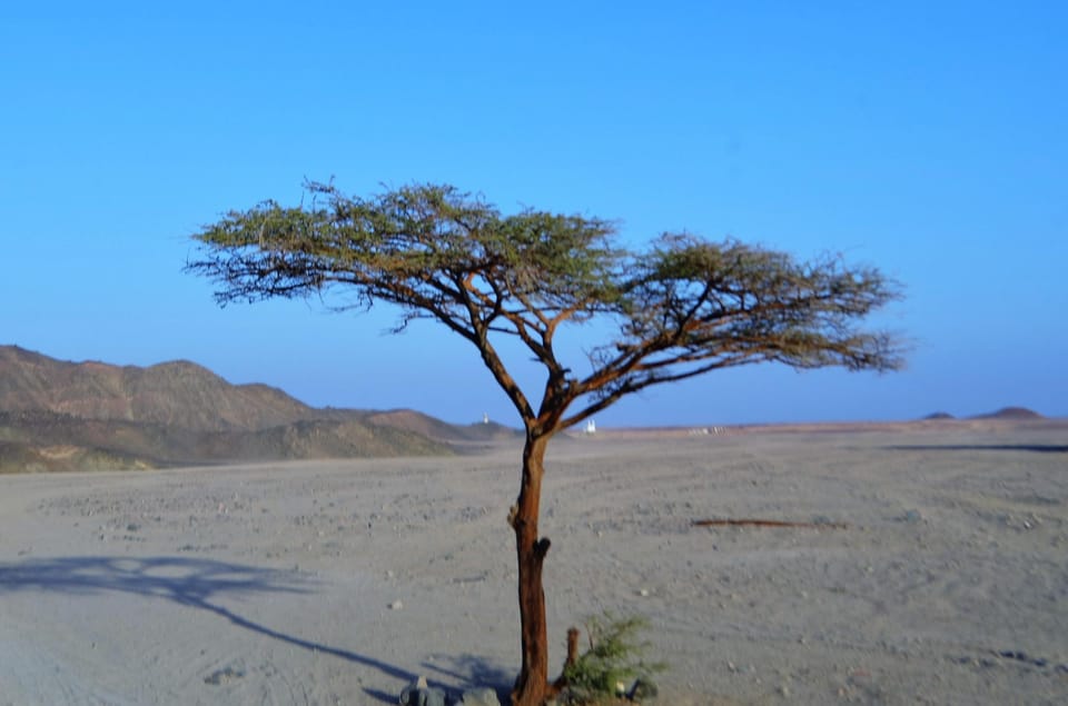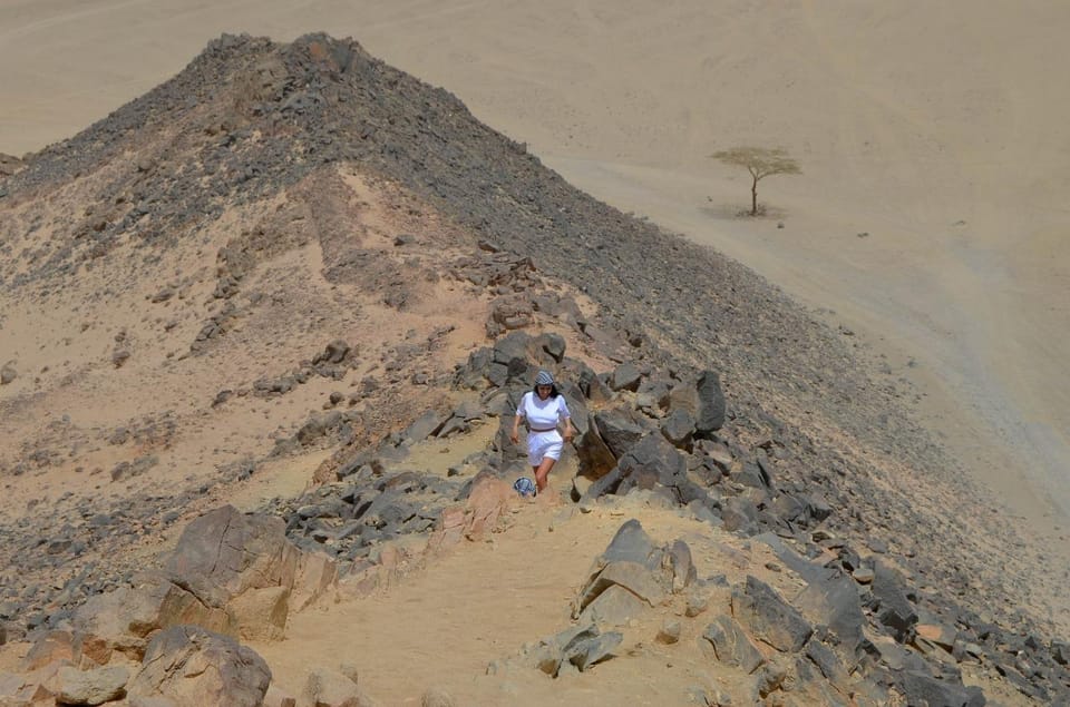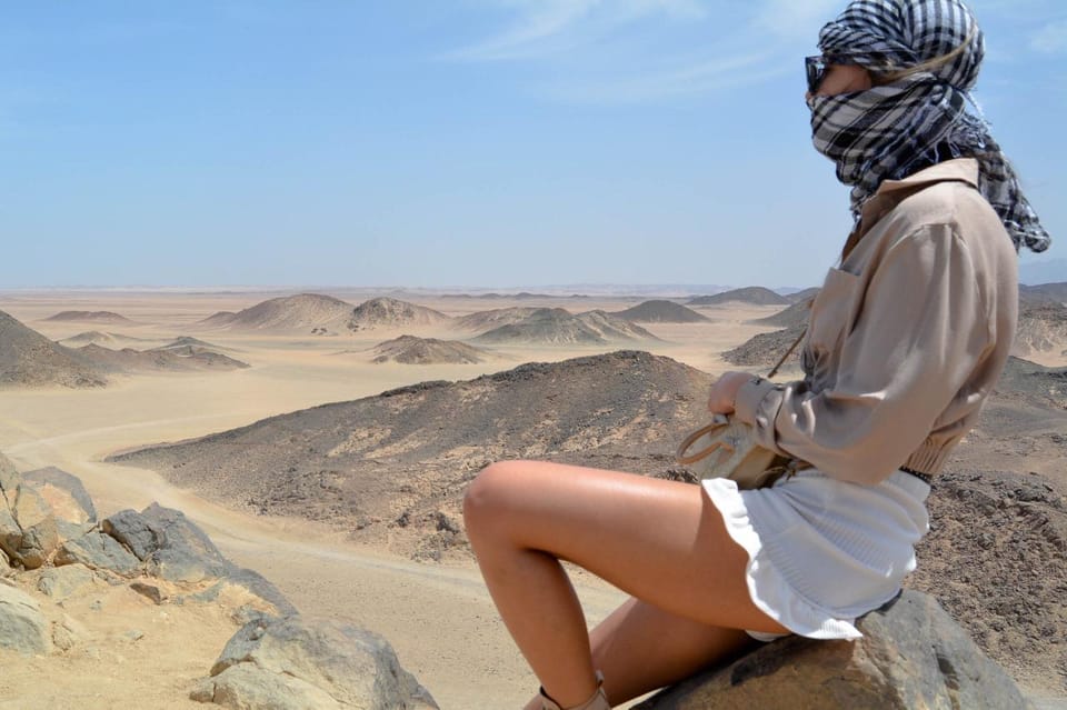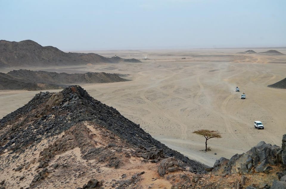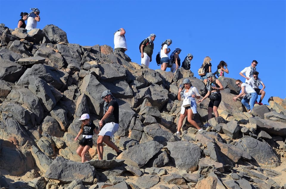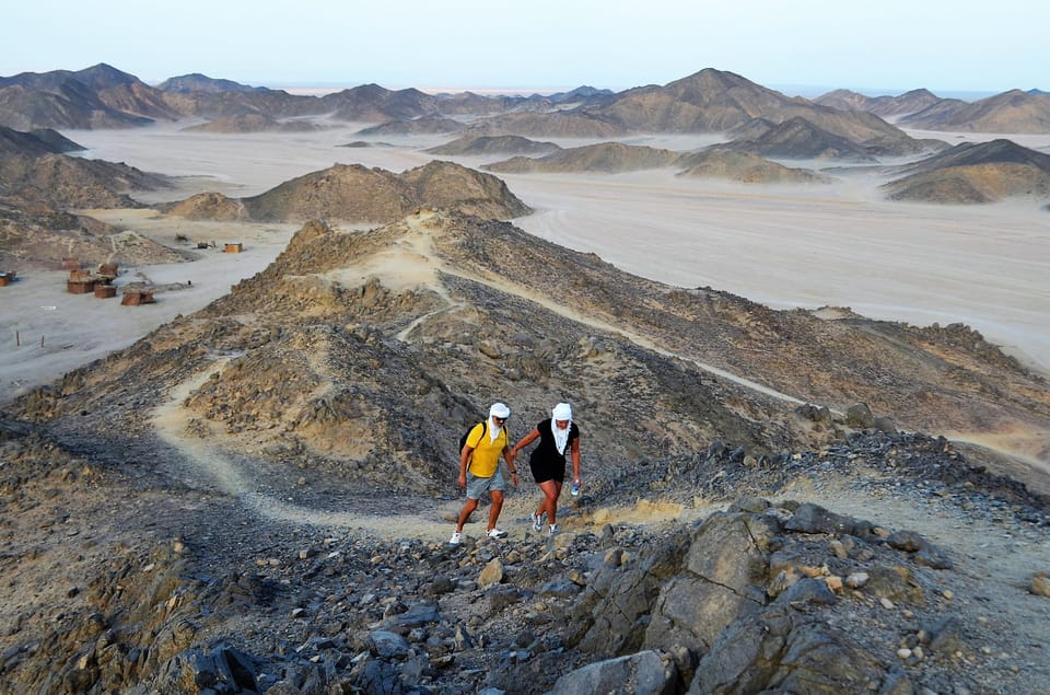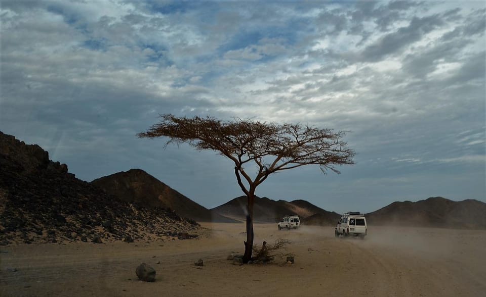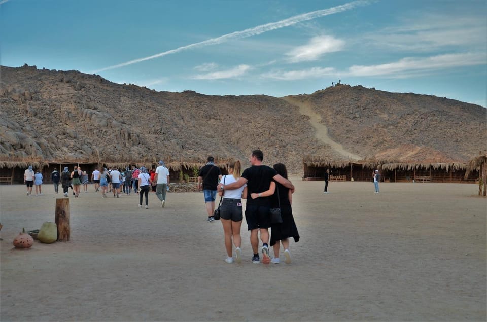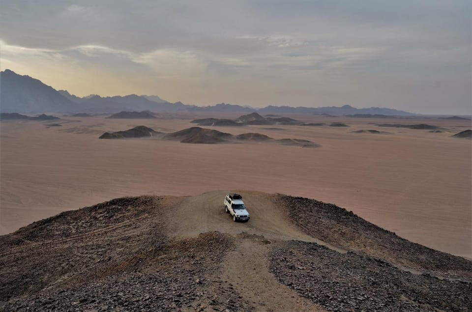 Begin your desert adventure with pickup from your hotel in Hurghada or El Gouna at 1:00 PM. Head deep into the Eastern Desert in a 4x4 Jeep, driving 35 kilometers between the rugged Red Sea mountains.
