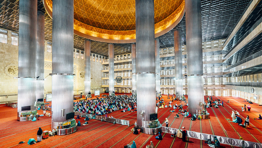 The Istiqlal Mosque, with its modern marble-covered design, is one of the most prominent buildings in Central Jakarta, and also one of the largest, occupying some nine hectares and standing five storeys high (like the five pillars of Islam). Its large prayer hall is rectangular and covered by a 45-metre diameter dome that is supported by 12 round columns (a number reminiscent of the prophet’s birthday). Although the interior is quite airy, the colours and shine give it a touch of elegance and luxury. Note the four rows of balconies in the main hall, the mihrab (the niche marking the closest point to Mecca), and the beautiful Arabic calligraphy with the names of Allah and Muhammad. Not many believers come here to pray and can resist taking a photo with their phones.