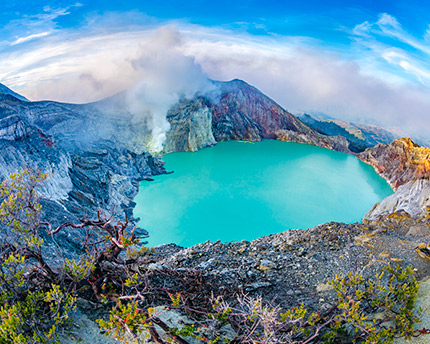 What Kawah Ijen really contains is not blue lava. The volcano releases large quantities of sulphur dioxide at temperatures of over 400ºC, giving it its characteristic blue colour. It is the largest warm lake in the world, with a diameter of one kilometre and a depth of approximately 200 metres.