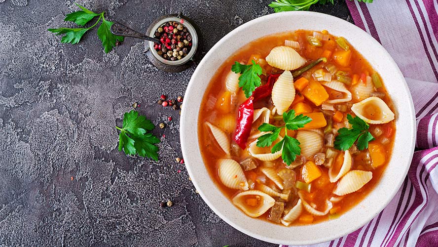 - Minestrone: This thick, vegetable-loaded soup is an absolute favourite. It’s usually made with seasonal vegetables such as beans, celery, carrots and tomatoes with pasta and rice.