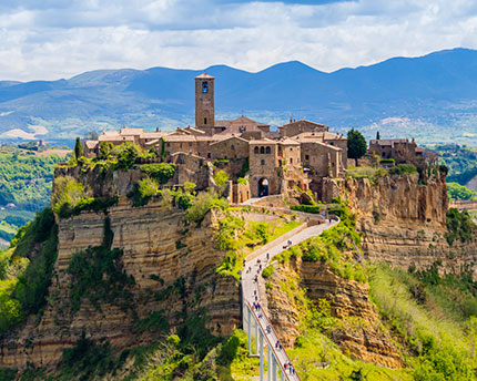 Cività di Bagnoregio is a very small town high up on a rock. It is close to Orvieto and it also has an Etruscan background. When the clouds surround the hill of volcanic rock, Bagnoregio looks like an island floating on a white sea. The hill has been slowly eroding away over the centuries and the only way of accessing the town is over a bridge.