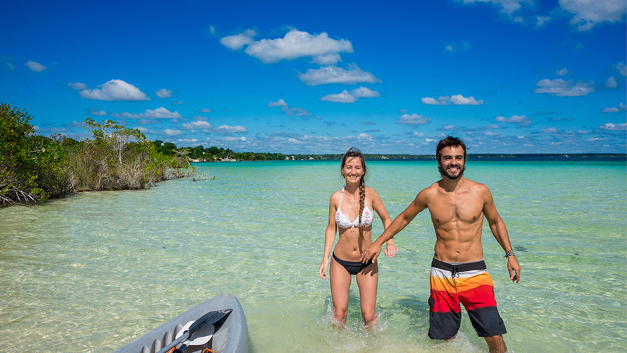 At the opposite end of Quintana Roo, to the south, the spectacular Bacalar Lagoon, also known as the “Lagoon of the 7 colors”, offers you a unique experience surrounded by nature. Close to 30 miles long and just over a mile at its widest part, this system of shallow lagoons, rivers, and cenotes changes color according to the characteristics of its different areas. A fascinating natural spectacle!