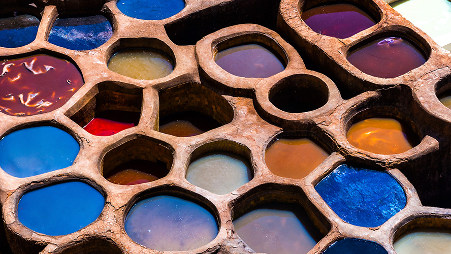 Seeing leather being worked in Fez’s biggest tannery is a spectacle not to be missed. To visit the yard where the tanners work, you need to ask permission from the shopkeepers around, so that they will allow you access to their terrace. They will give you a few bunches of mint, which are essential if you want to see the skins being processed and be able to withstand the smell. You need to look carefully at the white vats, where the animal skins are cleaned with pigeon excrement, and at the brown vats, where natural dyes and fig oil are applied to give the leather the colour and softness that we can then see in the slippers, bags and pouffés for sale in the shops.