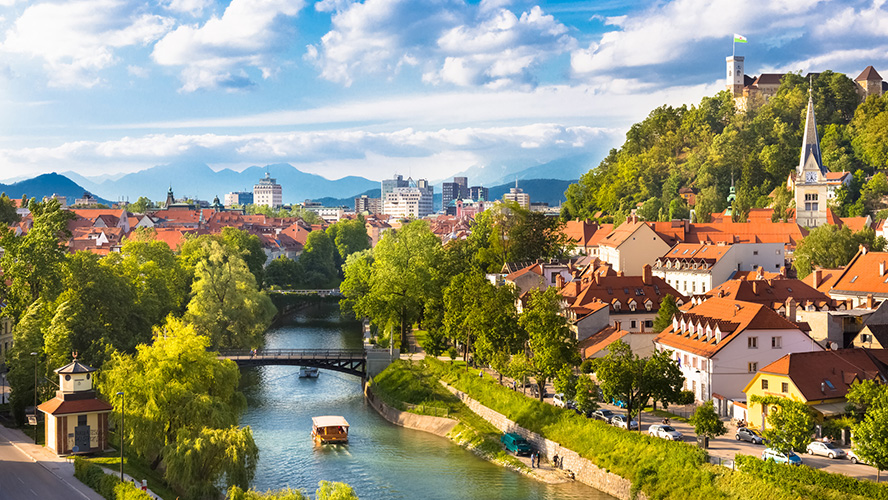 Ljubljana, with its laid-back, cosmopolitan ambience, is the cultural, political and financial capital of Slovenia. Its cobbled streets, lined with Baroque and Modernist buildings, are reflected in the waters of the river Ljubljanica as it winds through its historic centre.