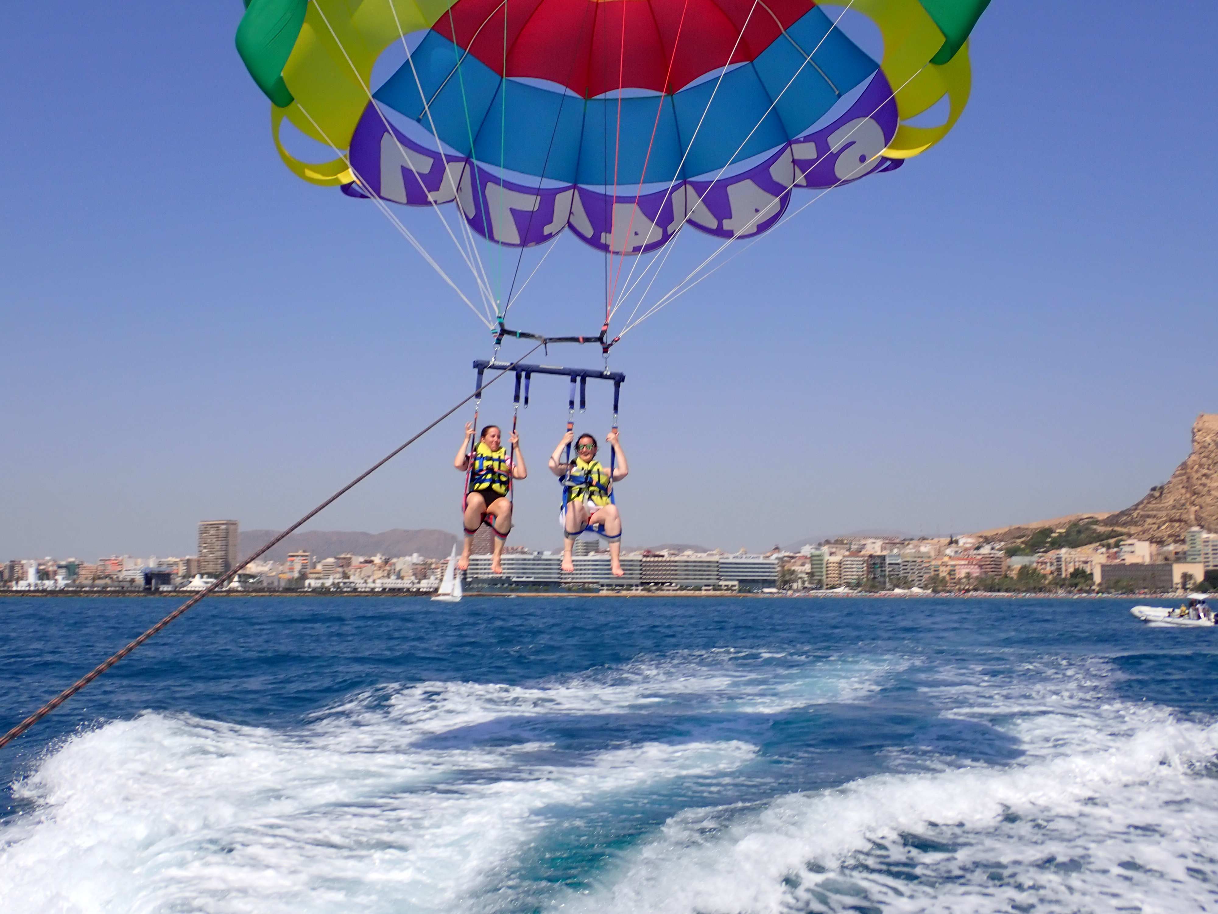 Parasailing involves being towed by a boat while secured to a specially designed parachute, lifting you to heights that can exceed 100 meters. From up there, the world seems to stand still. The city of Alicante unfolds before your eyes: its golden beaches, such as the famous Postiguet Beach or the peaceful San Juan Beach, the imposing Santa Bárbara Castle perched atop Mount Benacantil, and the lively marina. The horizon blends the deep blue of the sky with the sea, creating an unforgettable postcard view.