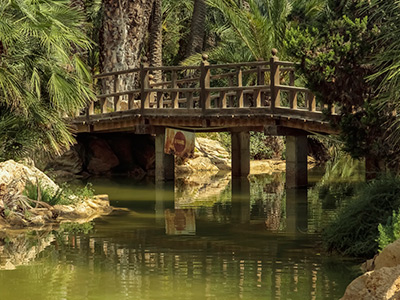 Besides its palm trees, the park also boasts a series of trails, bridges and water areas in the shape of small artificial rivers, waterfalls and a lake, lending a great beauty to the park and cooling the atmosphere on the hottest days. A stroll around the park is always a pleasant experience, with the sea—located other side of the main road—serving as a permanent backdrop to the walk.