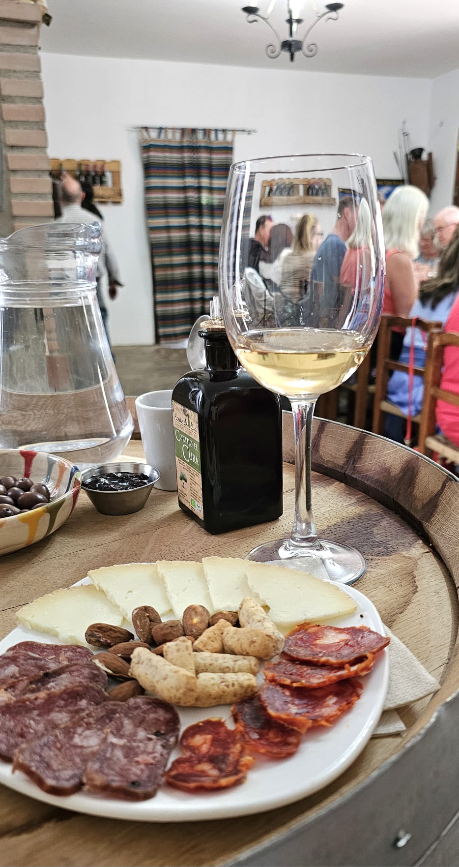 You will taste products from our farm or made in an artisanal way. The tasting consists of: homemade bread with our organic olive oil and jam, breadsticks, olives and almonds from the farm. Cured meats and cheese from Laujar. All accompanied by 5 of our organic wines or must for children.