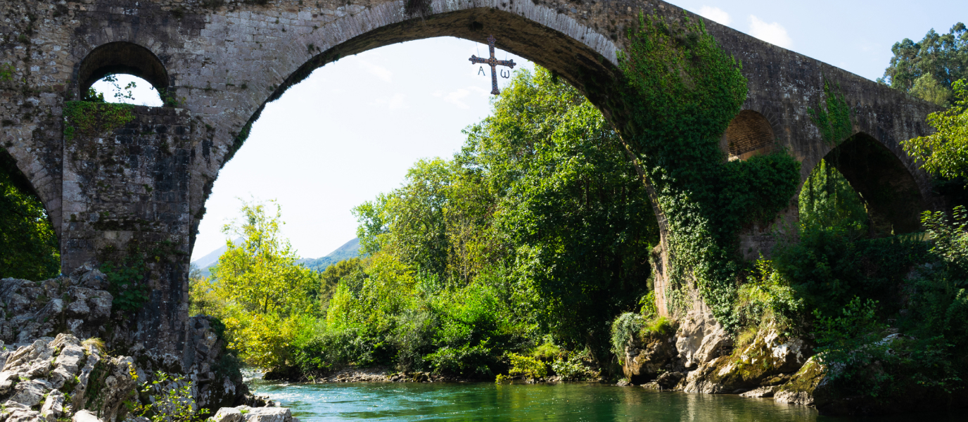 This iconic monument was built over the Sella River in the 13th century and separates the parishes of Cangas de Onís and Parres. A replica of the Victory Cross hangs from the middle arch with the Greek letters alpha and omega suspended from the left and right arms, representing beginning and end, the infinite extension of God. Today, the Victory Cross is an emblematic symbol of Asturias.