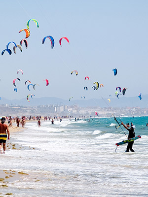 Tarifa’s most popular kitesurfing spots are the Playa de los Lances (although not in summer, when it is forbidden), the Playa de Dos Mares and the Playa de Valdevaqueros. The latter is the most popular amongst kitesurfers. This is a very long beach, located 5 kilometres from Tarifa, with a parking area that allows you to park your car right next to the ocean. This saves you the hassle of lugging all of your kit down a long trail towards the water.