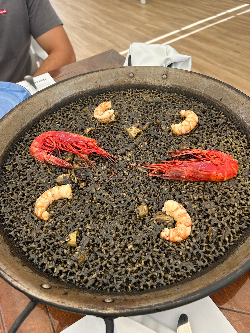 Black Rice with Carabineros, made with squid, dogfish, shrimp tail and squid ink. Its intense flavor is balanced with the freshness and minerality of aTerras Gaudas, the Galician wink that completes this experience.