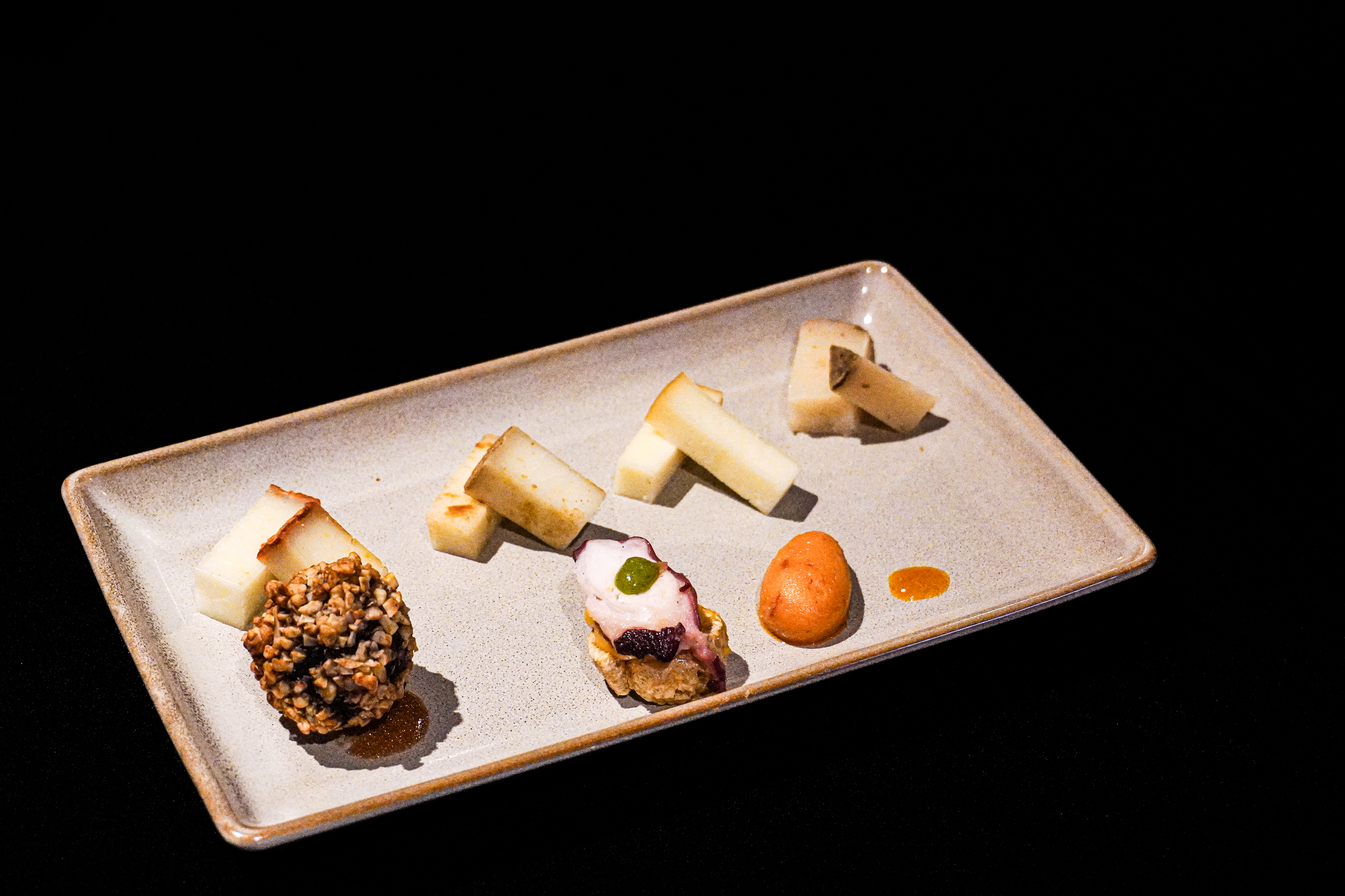 Burrata de las cumbres de Gran Canaria with semi-dried tomatoes, Mogán avocado tartar, cold almond cream and smoked butter.