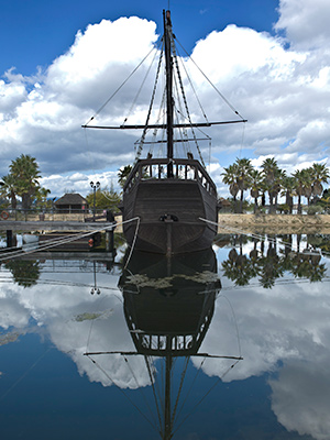 The Wharf of the Caravels is on the banks of the Río Tinto in the outskirts of Palos de la Frontera. Moored to the custom-built wharf are replicas of the Pinta, the Niña and the Santa María.
