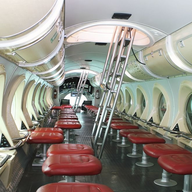 With a capacity for 44 passengers, the submarine has 22 windows, every 80 centimetres in diameter, and two other navigation windows, one at each end, 160 centimetres wide. It is equipped with six electric motors and has a complete duplicate security system. In addition, a control boat on the surface maintains constant communication with the submarine at all times.