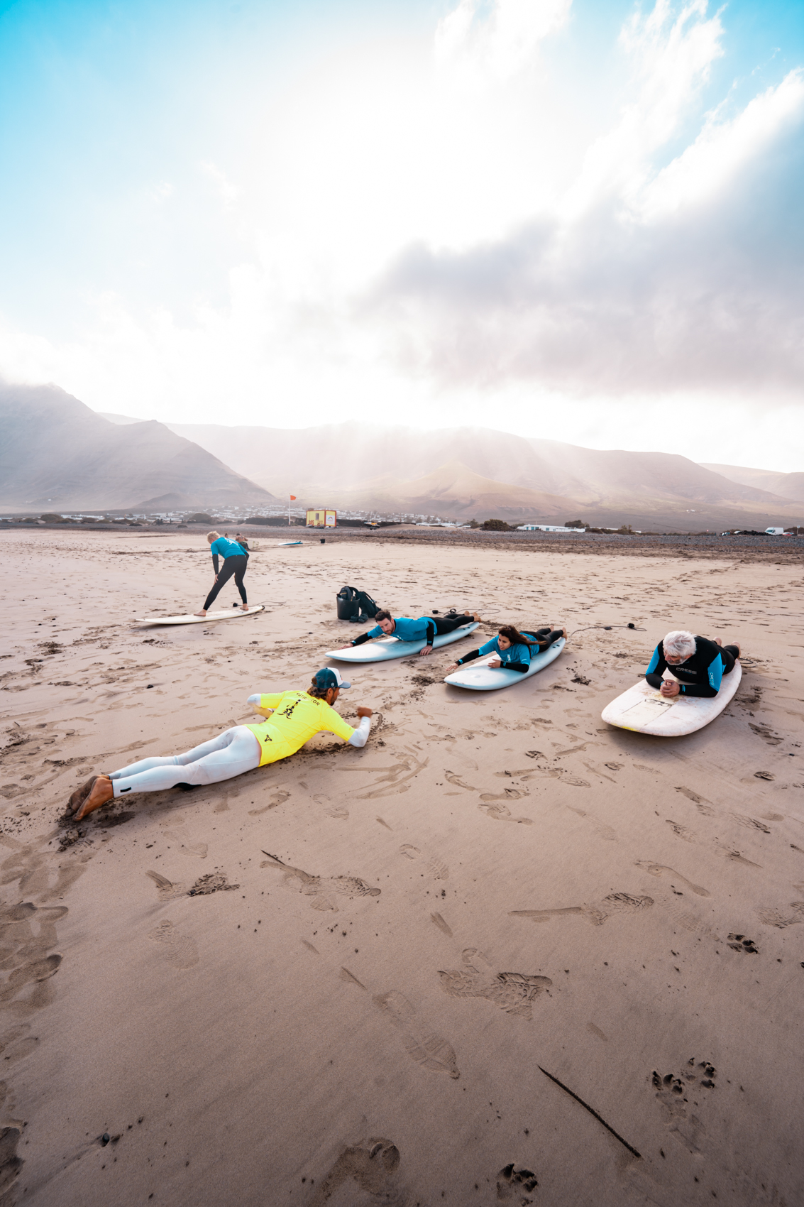 Our goal is to help you build confidence and safety in the water, developing the skills you need to move among the waves. This activity takes place every day of the year; we pick you up from your hotel and take you to the surf spot, typically on Lanzarote's best beach: Famara.