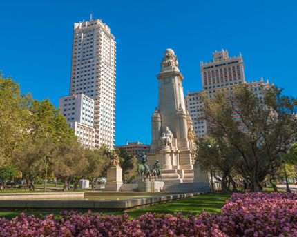 The Plaza de España is dominated by the Edificio España with its unusual neo-Baroque-style tiered façade. One of the city’s most typical skyscrapers (since it was built in 1955), it is currently recovering its original splendour in readiness for a new lease of life as a leisure and accommodation centre, after being closed for years.