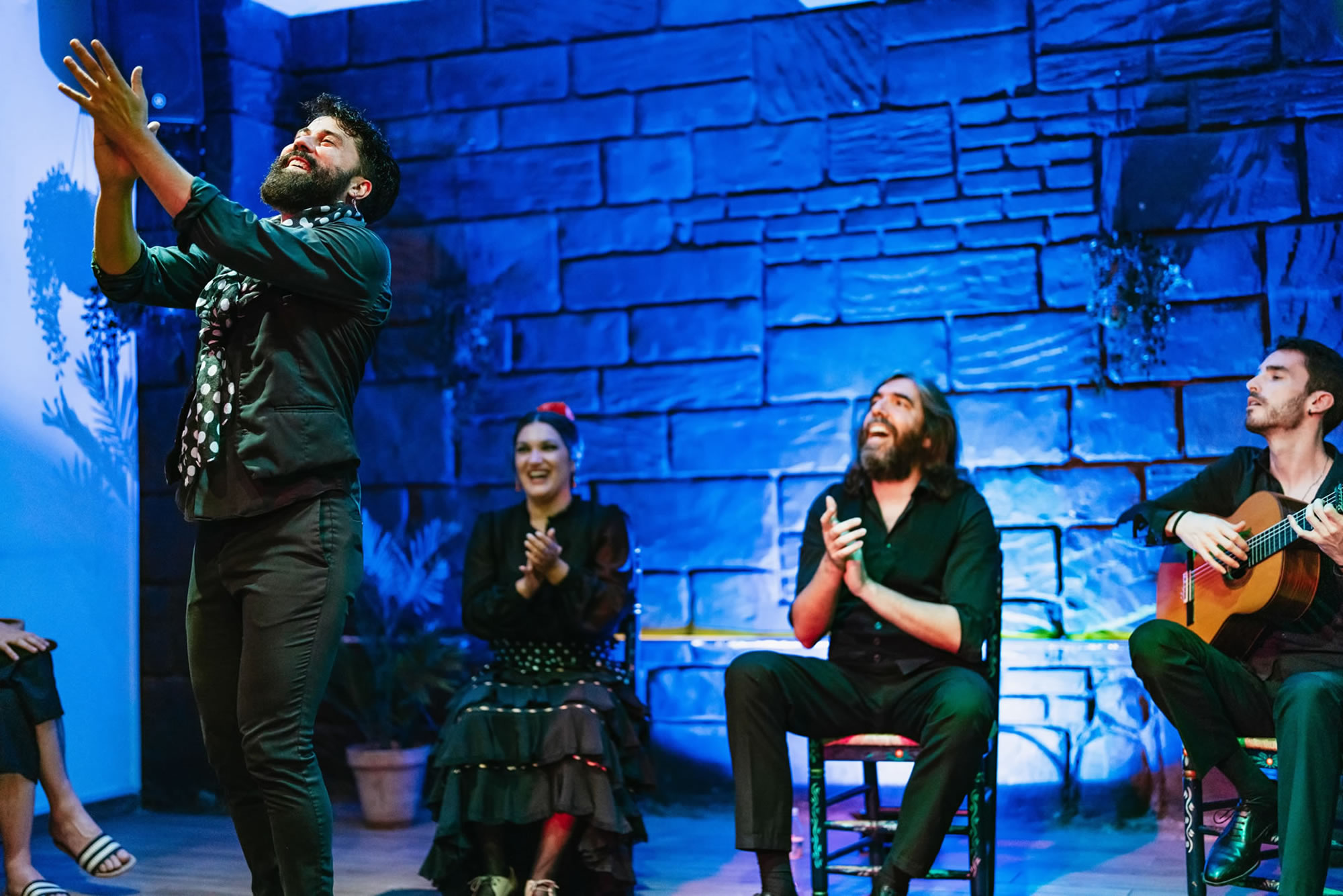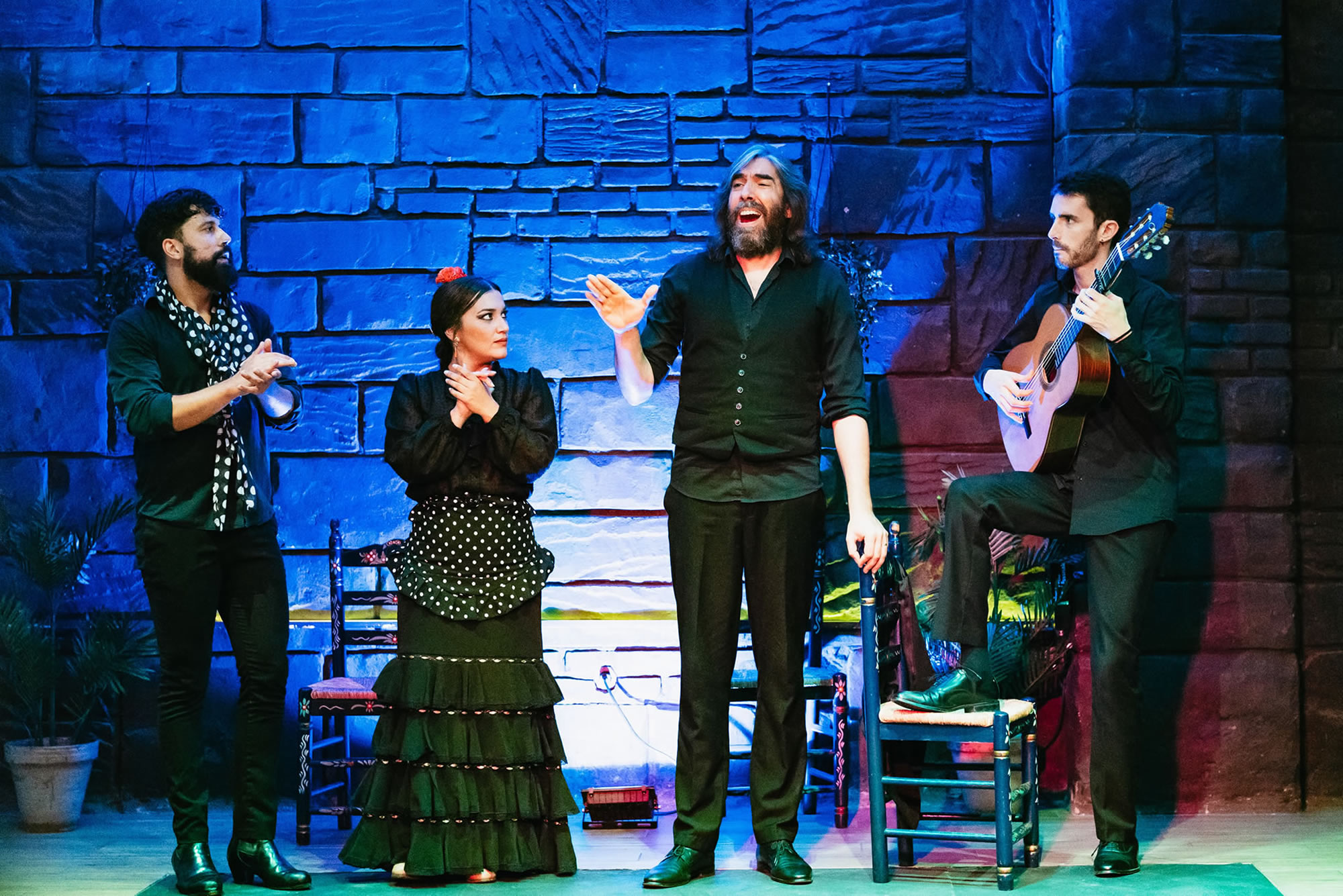 -Tablao flamenco show in the heart of the old cava of Triana. Four artists on stage: singer, guitarist, male dancer, and female dancer.