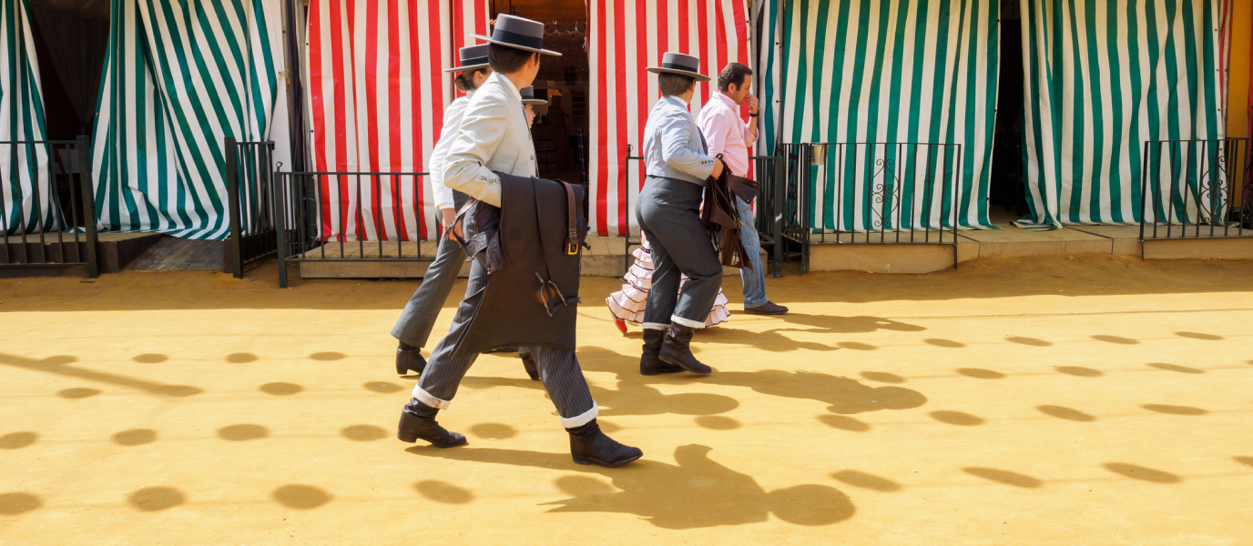 It’s quite a sight to see the horse-drawn carriages (internal link) arriving at the Feria bearing Sevillian women wearing flamenco dresses. This outfit has been an integral part of the Feria since the Exposition of 1929. In fact, it’s the only regional form of dress that has a fashion show exclusively dedicated to it, showing off the new trends for each season: SIMOF. Men attend the Feria in traditional country dress. Failing that, at night they wear suits and ties, and dress fairly formally during the day too.