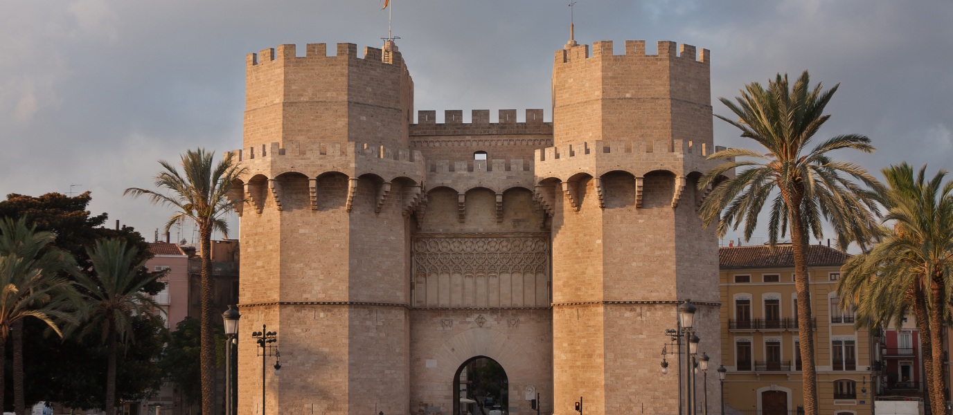 To the north of the city’s historic centre, the fortified gate of the Torres dels Serrans, on the banks of the river Túria, marks what was for many centuries the boundary of the walled city of medieval Valencia. Considered one of the finest examples of fourteenth-century military architecture, this was the main entrance to the city and owes its name to the fact that it faces towards the region of Els Serrans, to the north on the Zaragoza road. This, together with the Torres de Quart, is all that remains of the gateway in the former city wall, which was demolished in the mid-nineteenth century to allow the city to expand. The gate has been declared a National Historic Artistic Monument, and its crenellated terraces afford wonderful views of Valencia and the river Túria.