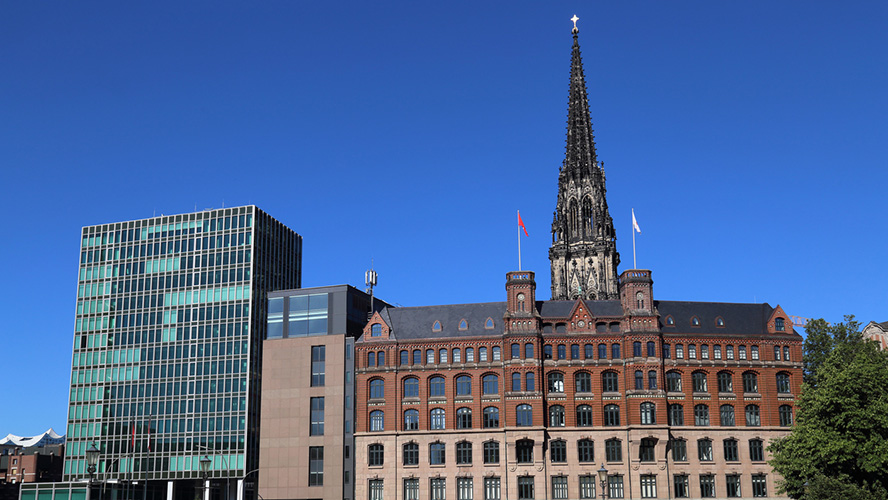 La espigada torre de esta iglesia, con sus más de 147 metros, es uno de los símbolos arquitectónicos de la ciudad de Hamburgo. Durante tres años, entre 1874 y 1876, se la consideró como la construcción más alta del planeta. Desde luego, en aquella época y hasta la II Guerra Mundial (1939-45), el conjunto religioso debió tener un aspecto imponente, siendo uno de los mejores exponentes del periodo neogótico.