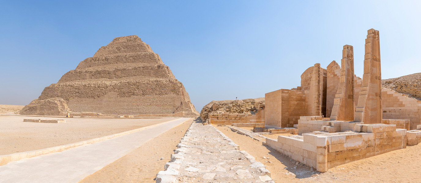 La Pirámide de Zoser, también conocida como Pirámide Escalonada, fue construida en el siglo XXVII a.C. por el arquitecto Imhotep a petición del rey Zoser. Los investigadores creen que esta fue la primera pirámide levantada en Egipto, además del monumento de mayor tamaño del Mundo Antiguo. Parece ser que el proyecto original no se corresponde con la pirámide de estructura piramidal con seis escalones que se observa ahora. Inicialmente se pretendía hacer una mastaba, de planta cuadrada, y con 63 metros por cada lado y 8 metros de altura. Sin embargo, se decidió añadir por los lados más capas de caliza de Tura. La pirámide actual tiene una base de 118 por 140 metros de base y una altura de 62 metros. A la misma se llega a través de un impactante pasillo con pilares. Se cree que los restos del faraón descansaban en el pozo de la Tumba sur.