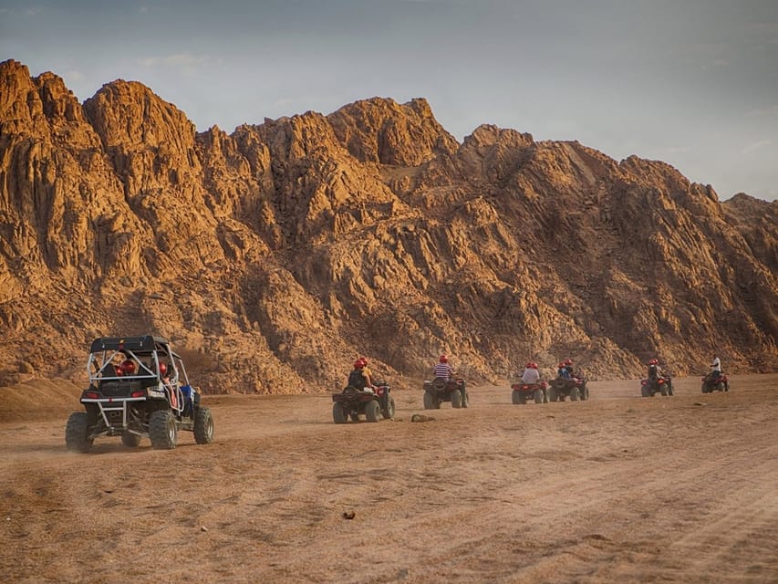 Una vez que te montas en tu cuatrimoto, el rugido del motor se mezcla con el silencio del desierto mientras corres a toda velocidad por arenas ondulantes. El viento pasa a toda velocidad y se lleva el calor del sol y el aroma fresco y seco de la naturaleza. Dirigido por unguía experimentado, recorrerás emocionantes senderos, atravesando espectaculares dunas y terrenos escarpados que muestran la belleza natural del Sinaí.