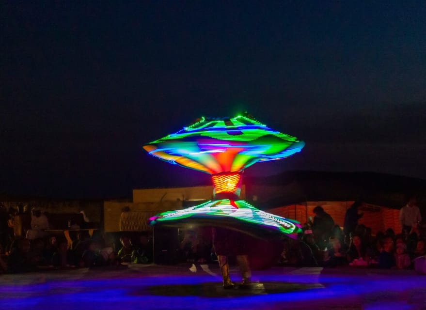 La noche cobra vida con uncautivadora actuación beduina. Siente el pulso detambores tradicionales, mira comobailarines se arremolinan en túnicas coloridas, y déjate llevar por melodías inquietantes que cuentan historias deleyendas del amor, la guerra y el desierto. La energía es contagiosa, ¡es posible que incluso te encuentres aplaudiendo o uniéndote a la celebración!