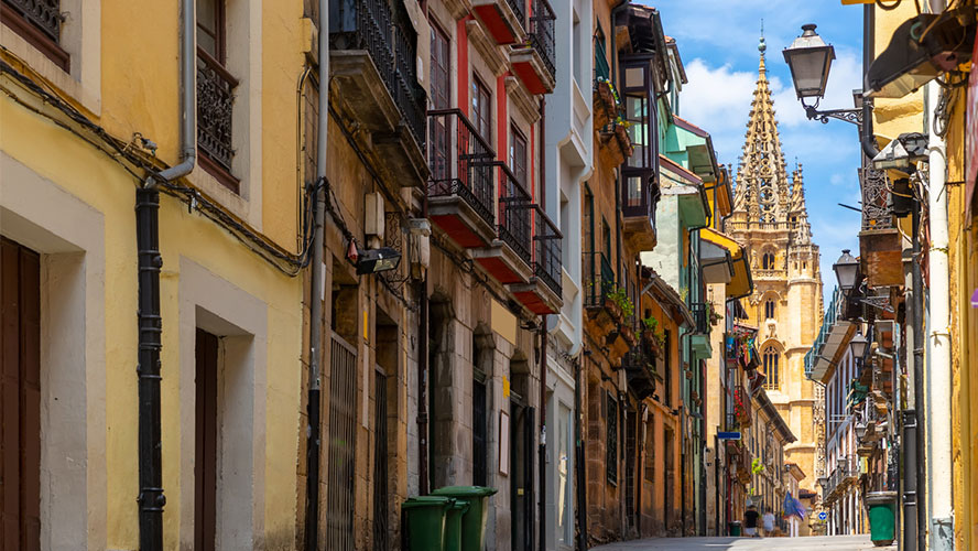 Esta torre, calificada como “poema romántico en piedra”, fue uno de los últimos elementos que se añadieron a la catedral de Oviedo durante su construcción. Era el año 1587, ya en los comienzos del Renacimiento, cuando sus autores, Rodrigo Gil de Hontañón, y Juan de Badajoz, la dieron por finalizada. Está compuesta por cinco cuerpos que se van retranqueando y que invitan a mirar al cielo. Desde la plaza de la Catedral de Oviedo se divisa la silueta en su totalidad. Atención: podemos aprovechar la ocasión para disfrutar de la estatua de La Regenta, situada en este mismo espacio.