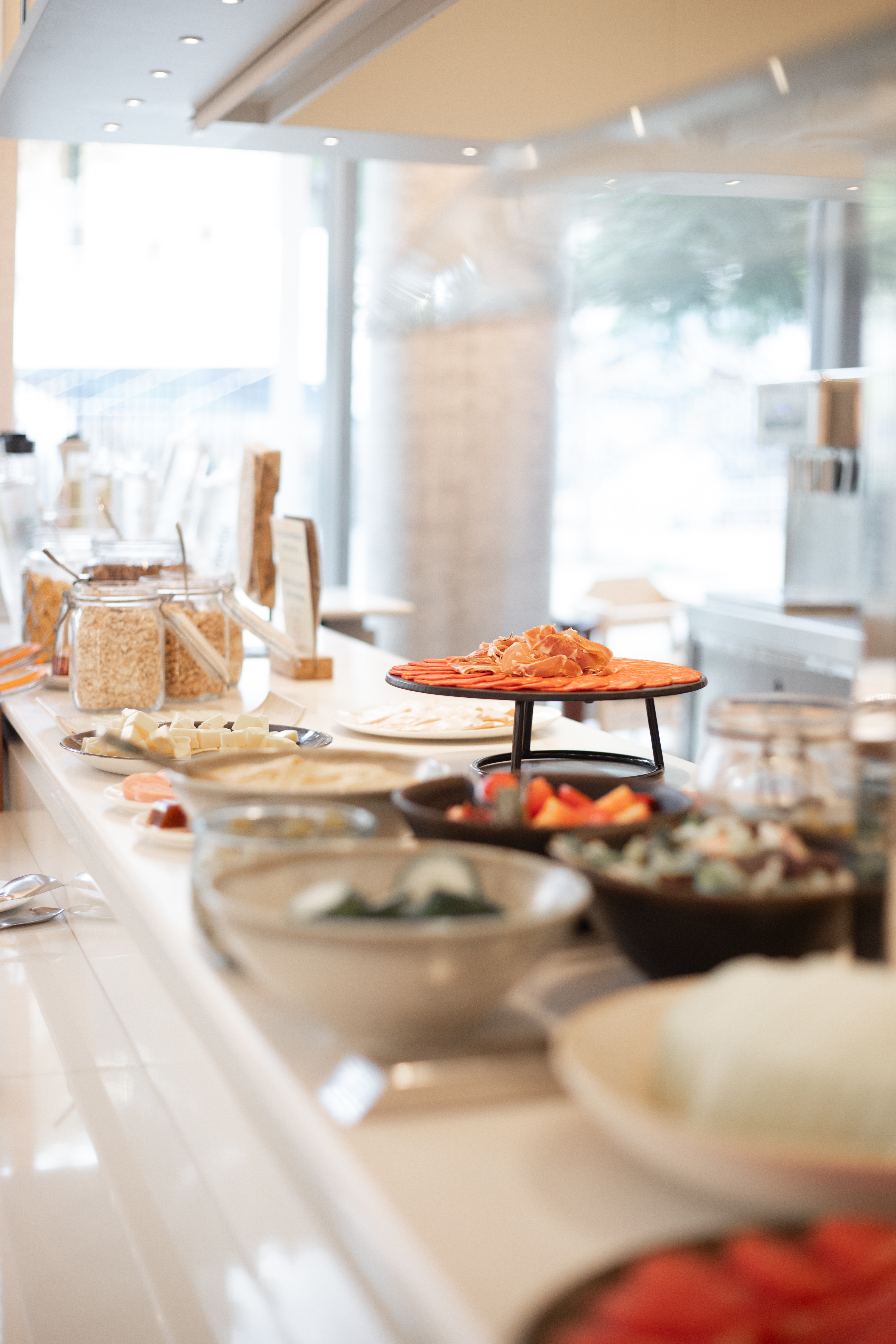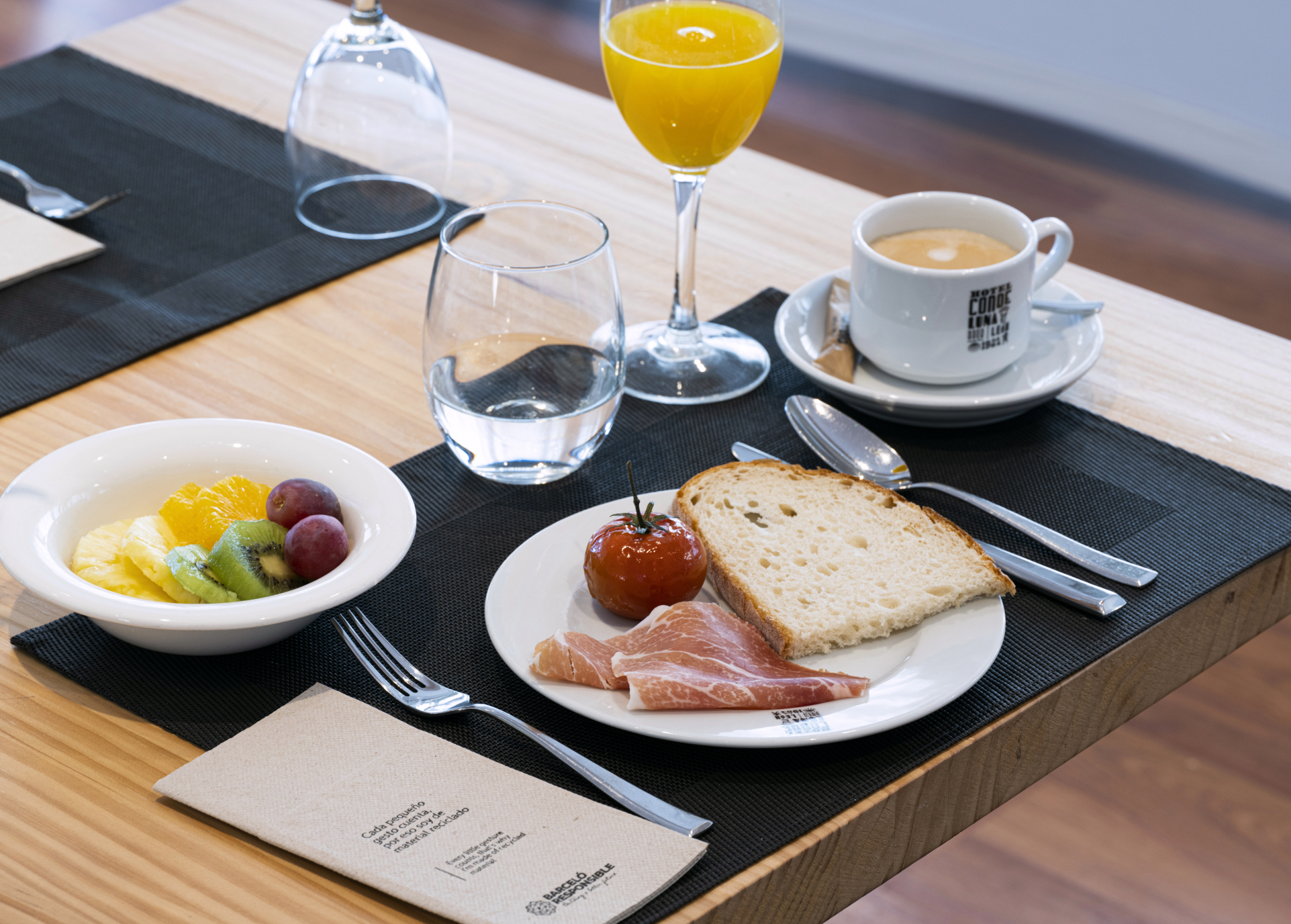 Elige entre una amplia selección de bollería artesanal recién horneada, ideal para acompañar con un café o infusión. Además, podrás disfrutar de una variedad de platos fríos y calientes, desde opciones ligeras como yogures y frutas frescas, hasta platos preparados al momento, embutidos de primera calidad y especialidades locales.