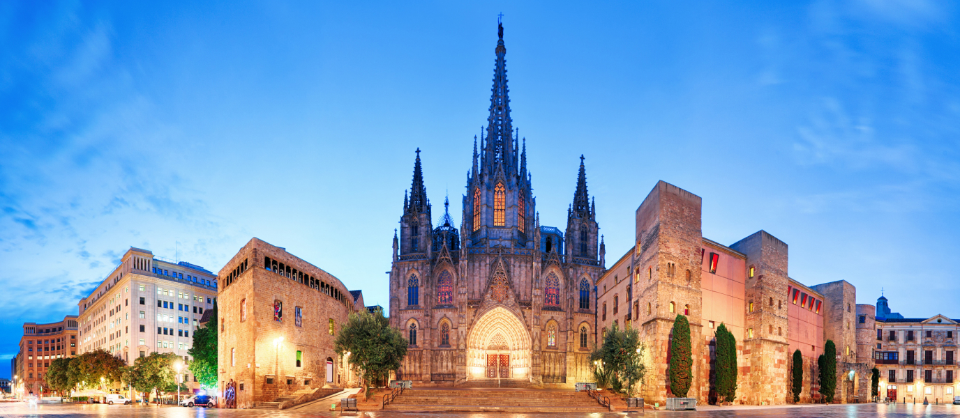 La Catedral de Barcelona –oficialmente Catedral de la Santa Cruz y Santa Eulalia- es un templo antiquísimo con una fachada relativamente moderna. En verdad, donde se asienta la actual catedral gótica hubo ya desde el siglo IV una catedral paleocristiana –cuyos restos pueden verse aún en el subsuelo y en el Museo de Historia de la Ciudad- que, tras el fuerte deterioro sufrido en la invasión del caudillo árabe Almanzor, en el siglo X, sería reemplazada por un nuevo templo románico. La construcción del actual templo gótico no comenzaría hasta el 1 de mayo de 1298 bajo el reinado de Jaime II de Aragón, prolongándose durante 150 años. Sin embargo, la fachada que el visitante puede apreciar desde la Pla de la Seu es mucho más reciente: fue a finales del siglo XIX, tras cuatro siglos inalterada, cuando con motivo de la Exposición Universal de 1888 el industrial catalán Manuel Girona i Agrafel sufraga los gastos para terminar una fachada proyectada en el siglo XV que nunca había llegado a realizarse. Así, el arquitecto Josep Oriol Mestres fue el encargado de construir el frontal neogótico, con sus dos pináculos laterales, mientras que Augusto Font Carreras puso la guinda al edificio con el cimborrio de 70 metros de altura, terminado en 1913.