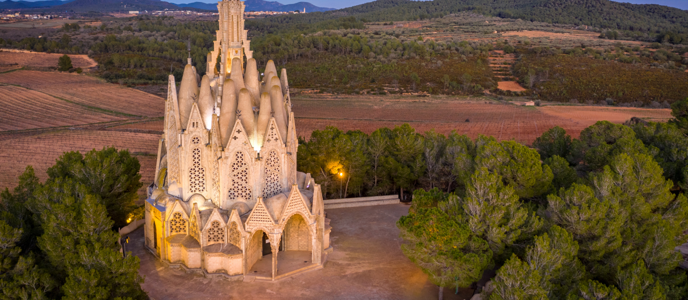 Sin detenernos en muchos detalles técnicos, te podemos decir que este santuario de Montferri muestra una planta en forma de barco (que mira a Montserrat) y que su estructura está compuesta por 120 arcos catenarios (o parabólicos), 42 pilares y 33 cúpulas. Desde el exterior es muy evidente su similitud con el perfil de las rocas de las montañas de Montserrat.