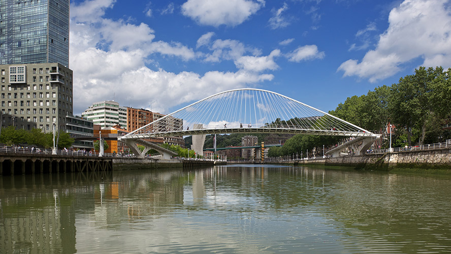 A este puente sobre la ría del Nervión se lo conoce también como “el de Calatrava” y prácticamente desde su inauguración, en 1997, ha estado ligado a la polémica. Fundamentalmente por el material elegido por el arquitecto valenciano para su pavimentación: el cristal. Teniendo en cuenta la humedad habitual en Bilbao, esto provocaba numerosas caídas de viandantes. Por eso el consistorio local decidió cubrir el suelo del puente con una especie de moqueta plástica. Con o sin resbalones, el puente conecta de forma peatonal el Ensanche de la ciudad con el Campo de Volantín, lugar de paseo habitual para muchos bilbaínos.