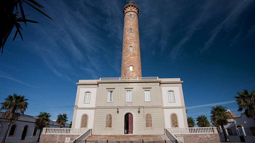 El Faro de Chipiona se encuentra en la misma punta del litoral urbano del municipio, en la confluencia del Atlántico y el Guadalquivir. Se alza sobre una plataforma rocosa a apenas unos metros del mar, rodeado por un paseo marítimo que conecta con la playa de Regla hacia el sur y con la zona de las corrientes hacia el norte. Su ubicación no es casual: desde esta posición, domina la entrada al estuario del Guadalquivir y proporciona una visibilidad de más de 25 millas náuticas.