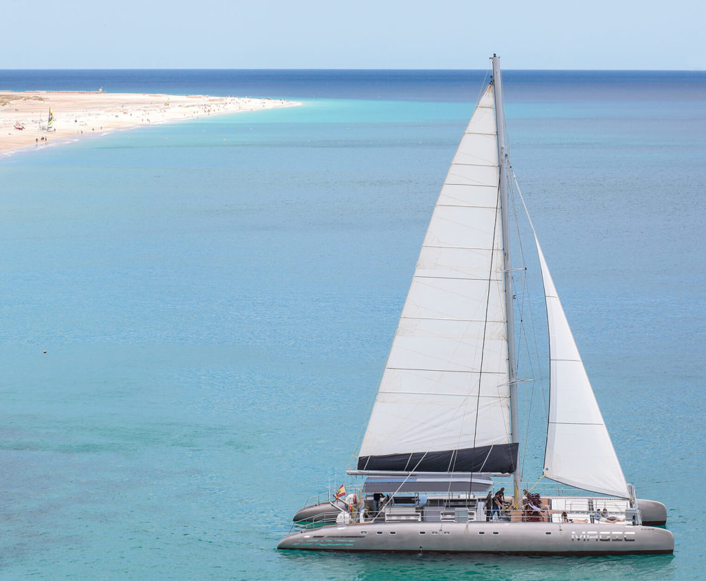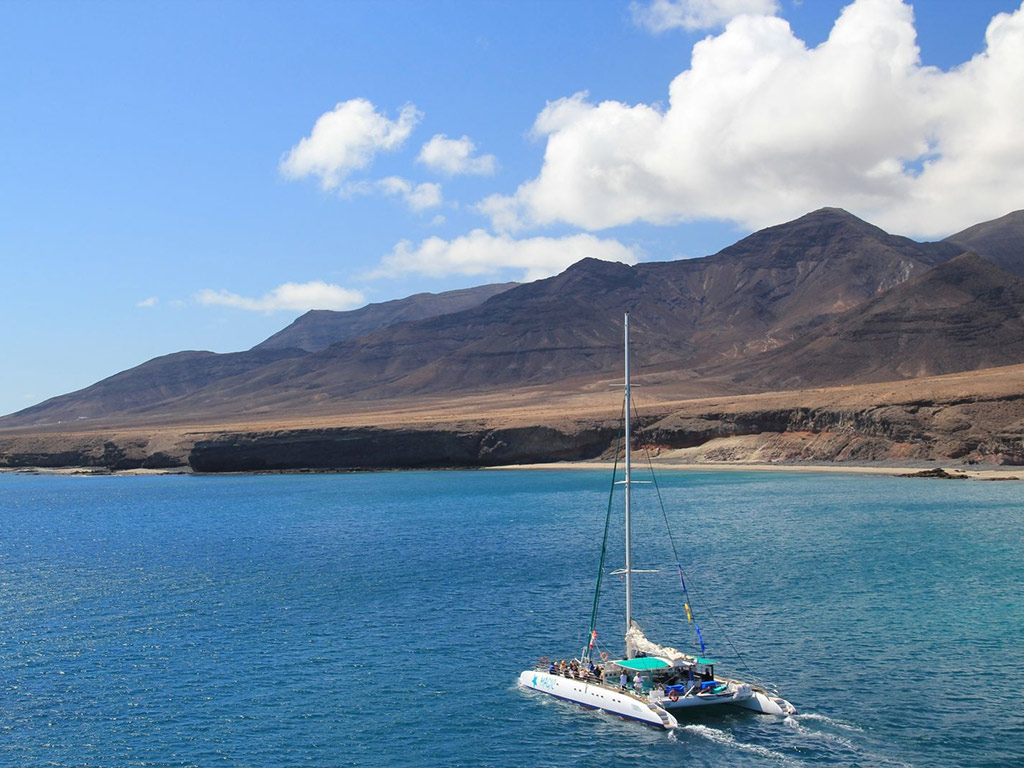 A bordo, un catamarán de lujo de 24 metros, podrás disfrutar de un fantástico día en el mar, navegando a lo largo de la impresionante costa volcánica del sur de Fuerteventura.