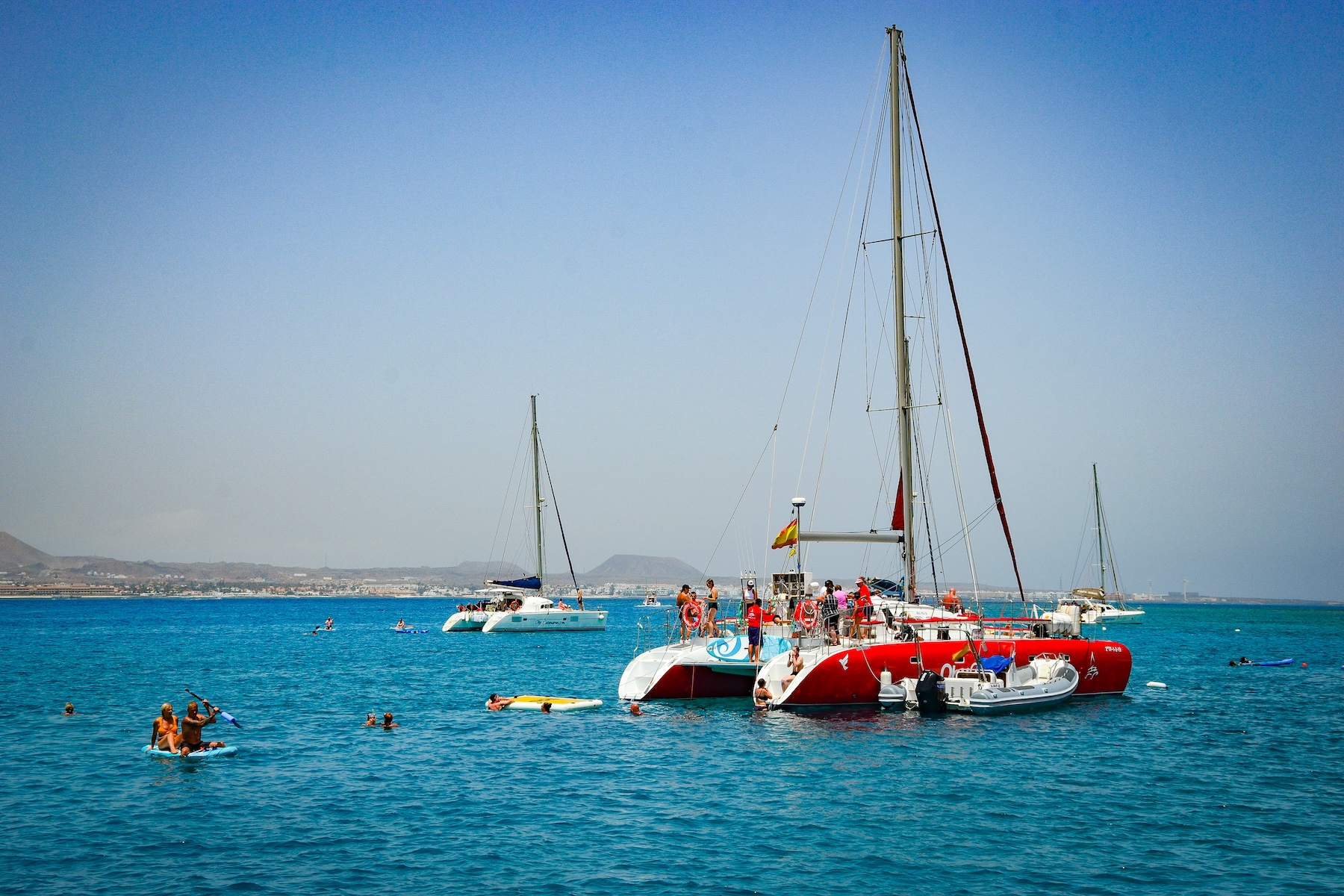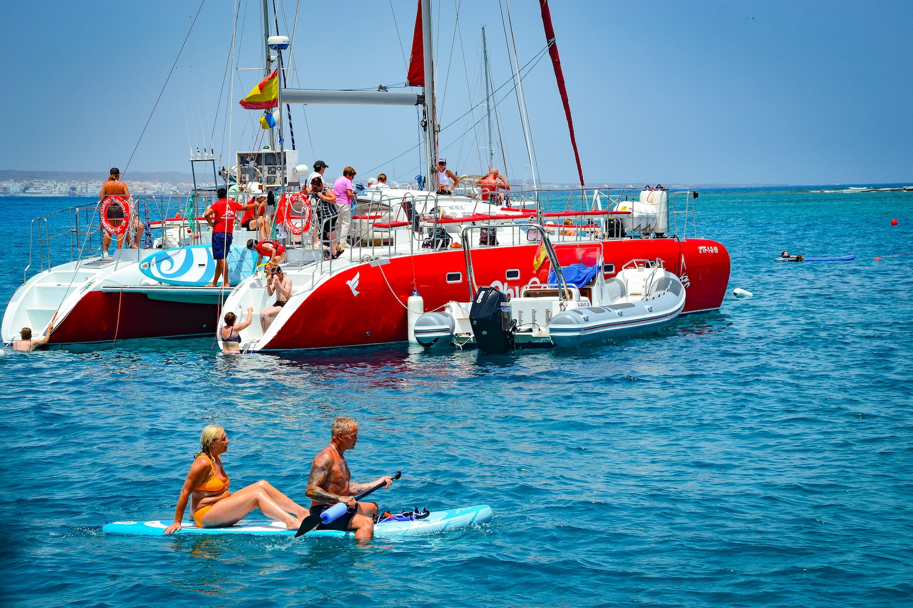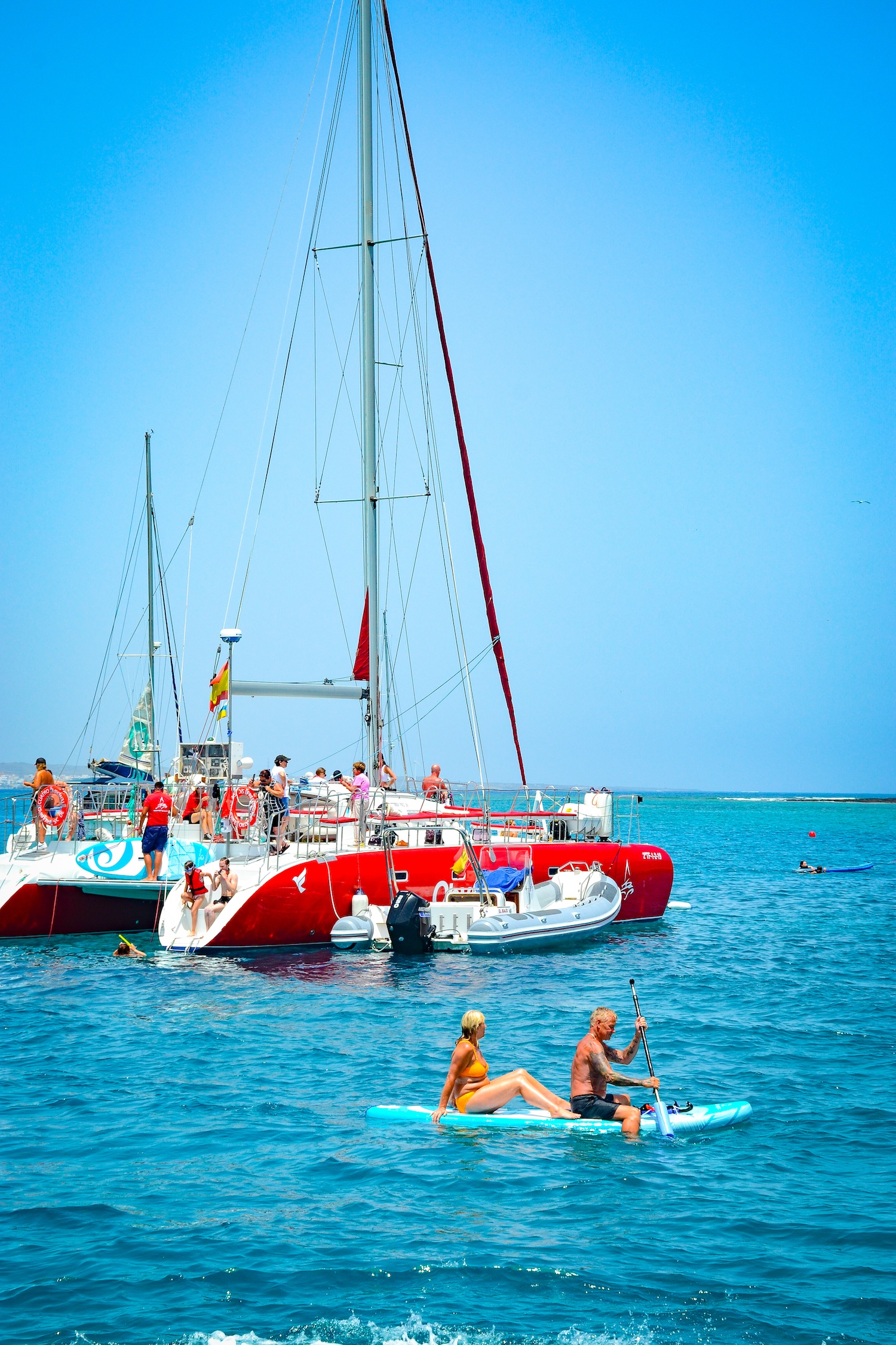 Asimismo, se les ofrecerá un delicioso almuerzo, que consta de paella, ensalada, fruta del tiempo y barra libre. También tendrá la posibilidad de desembarcar en el Islote de Lobos para visitarlo, aproximadamente durante 1 hora. El catamarán dispone de material para que puedan disfrutar de actividades acuáticas, como: snorkel (gafas y tubos disponibles) y stand up paddle.