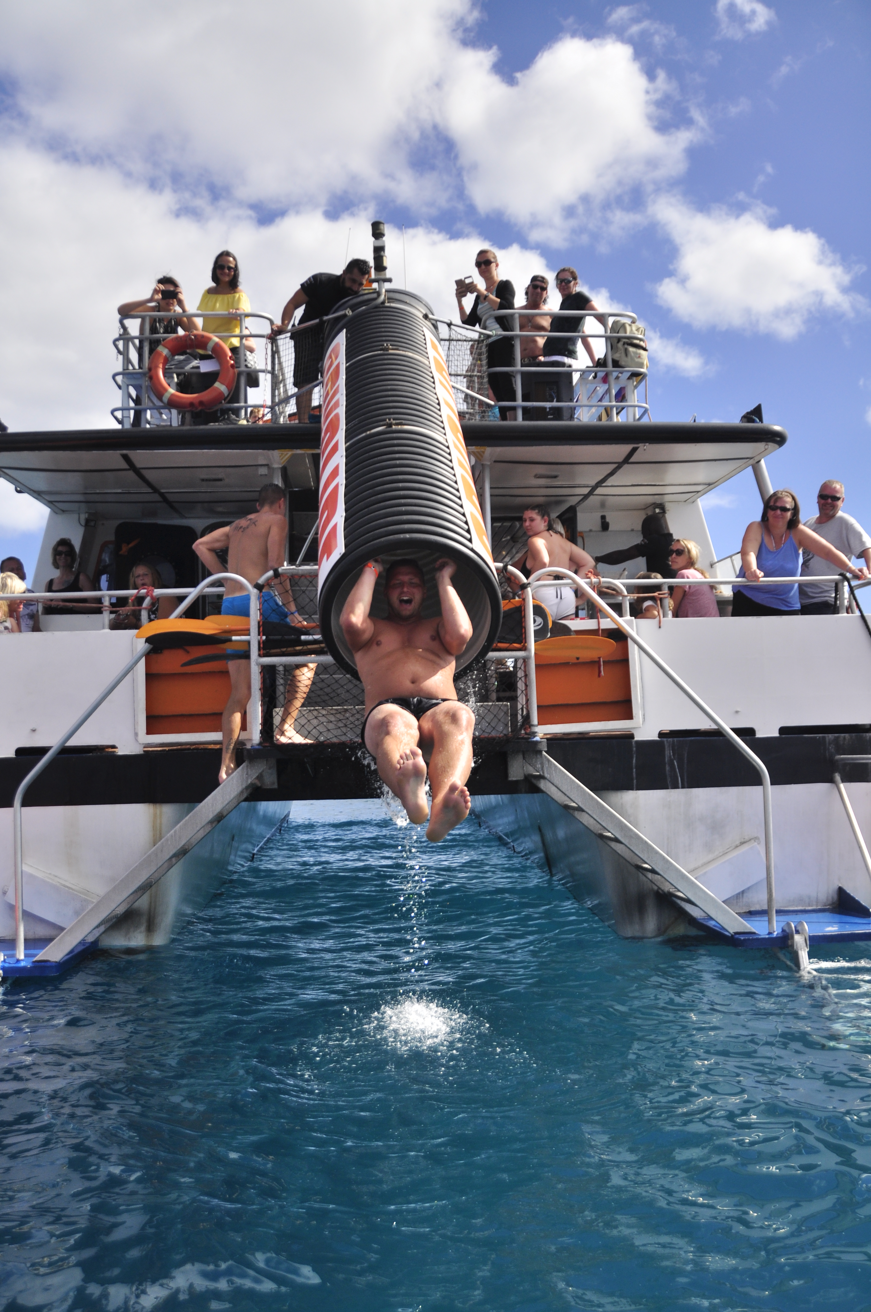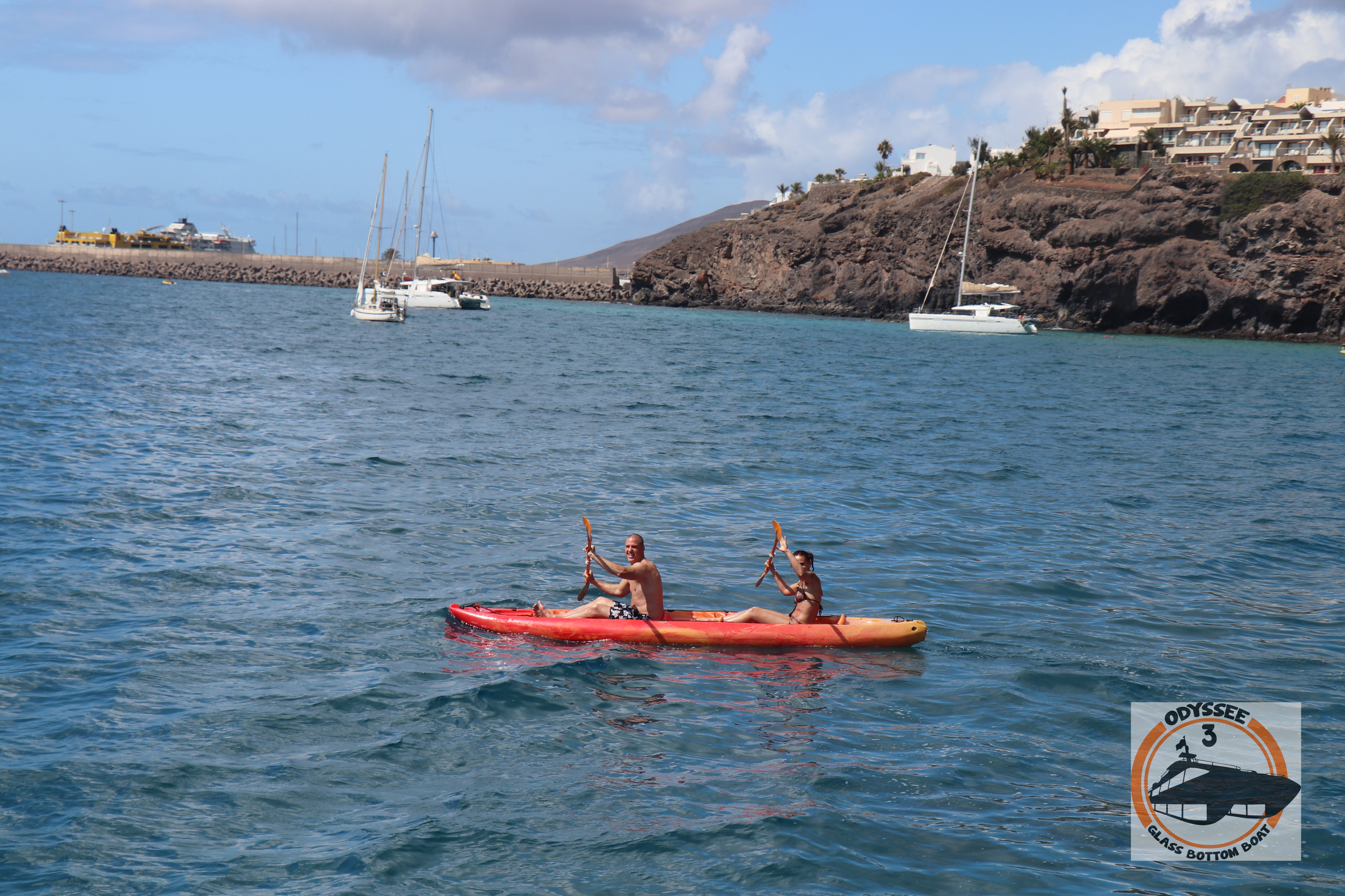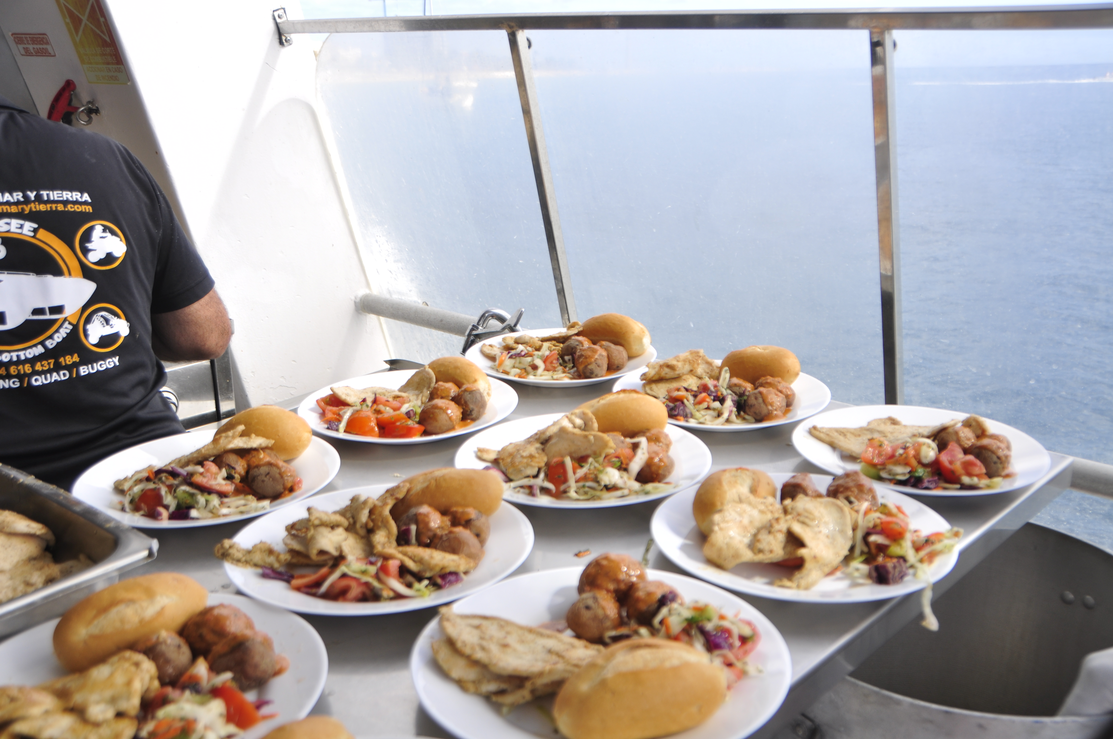 Luego haremos una parada para disfrutar de nuestras actividades acuáticas: podrás bañarte, hacer snorkel, kayak, deslizarte por el tobogán, dar un paseo en nuestro barco rápido o simplemente relajarte al sol, si así lo prefieres. Durante esta parada, también deleitaremos tu paladar con un delicioso almuerzo canario y nuestros exclusivos cócteles.