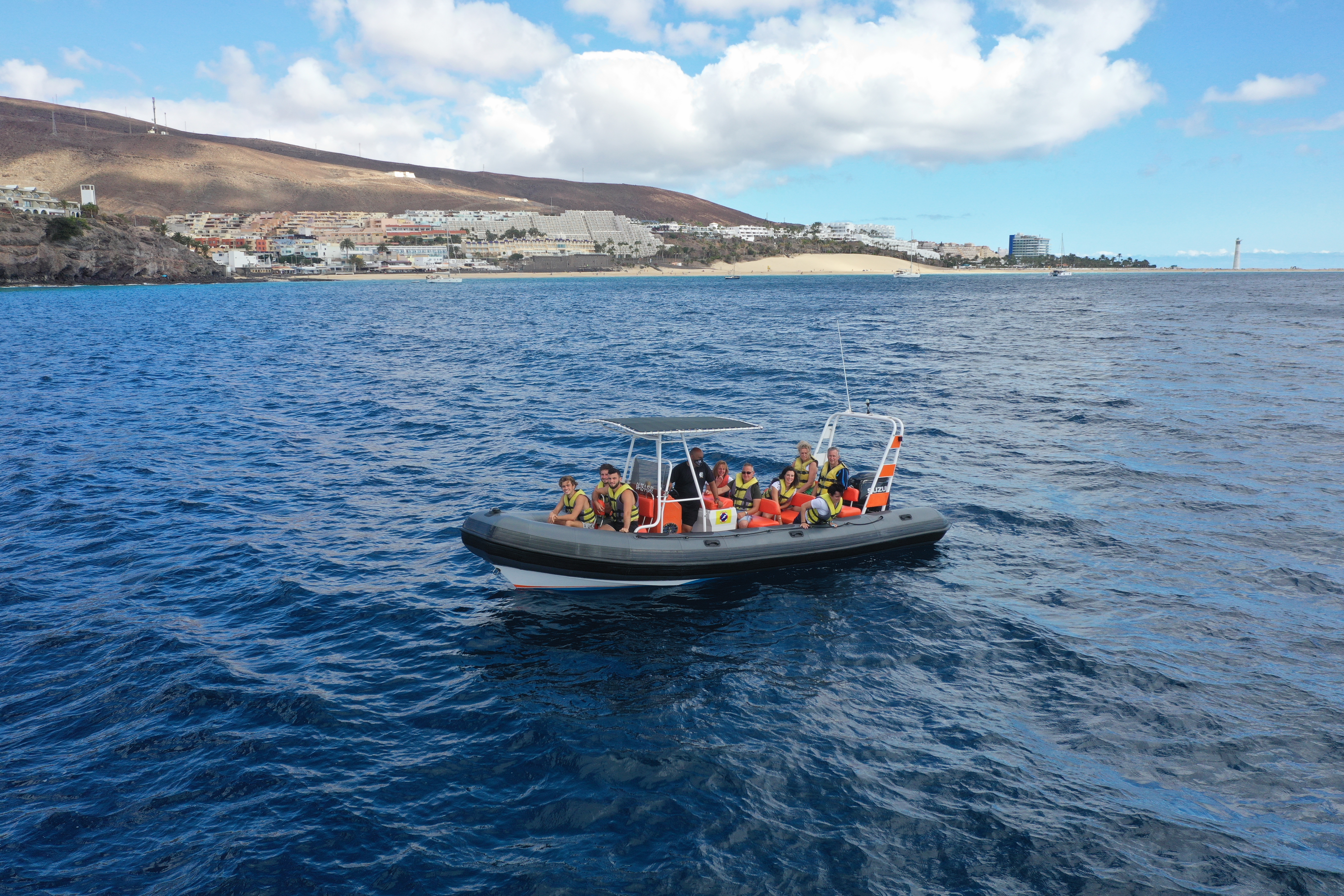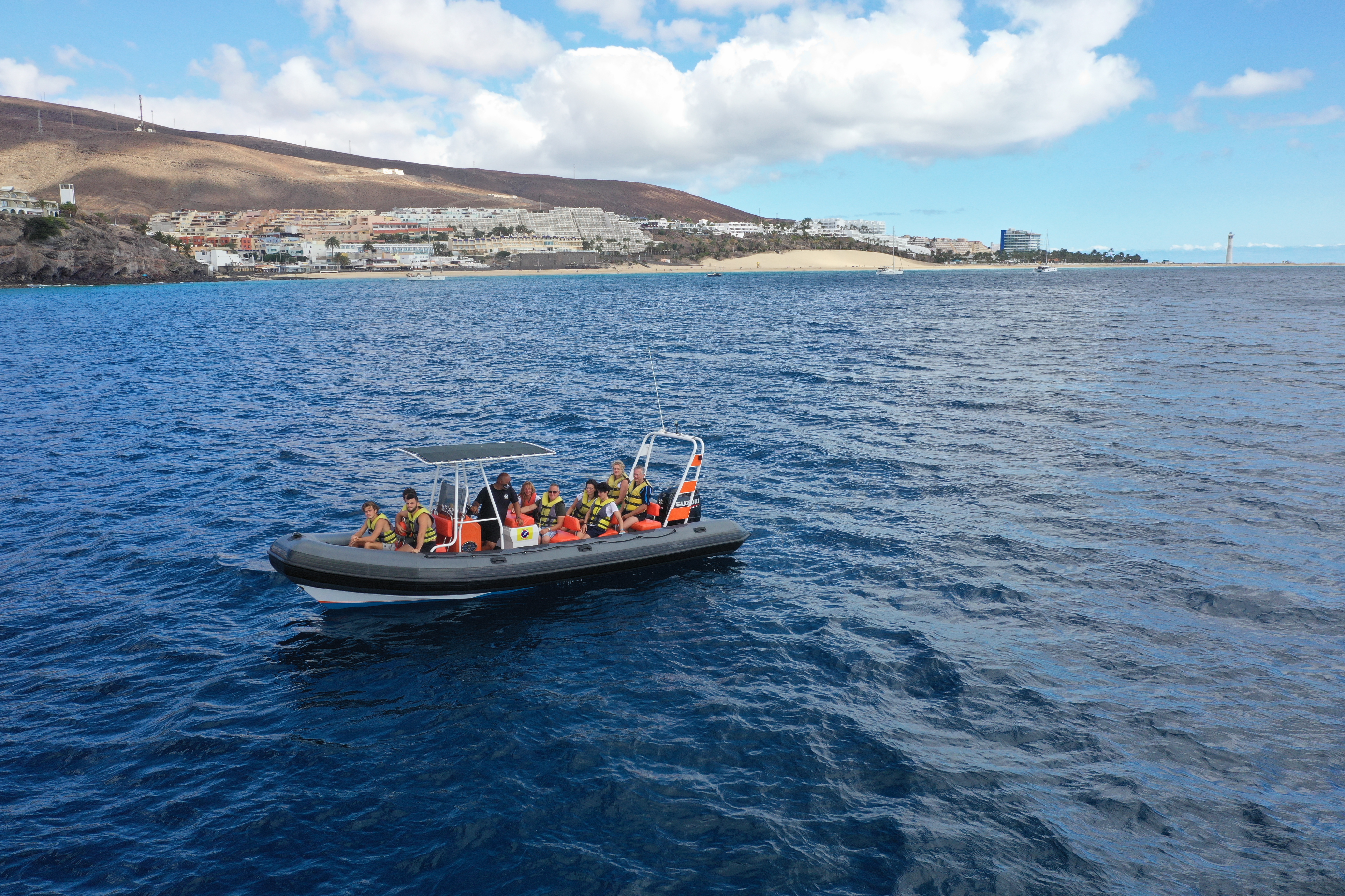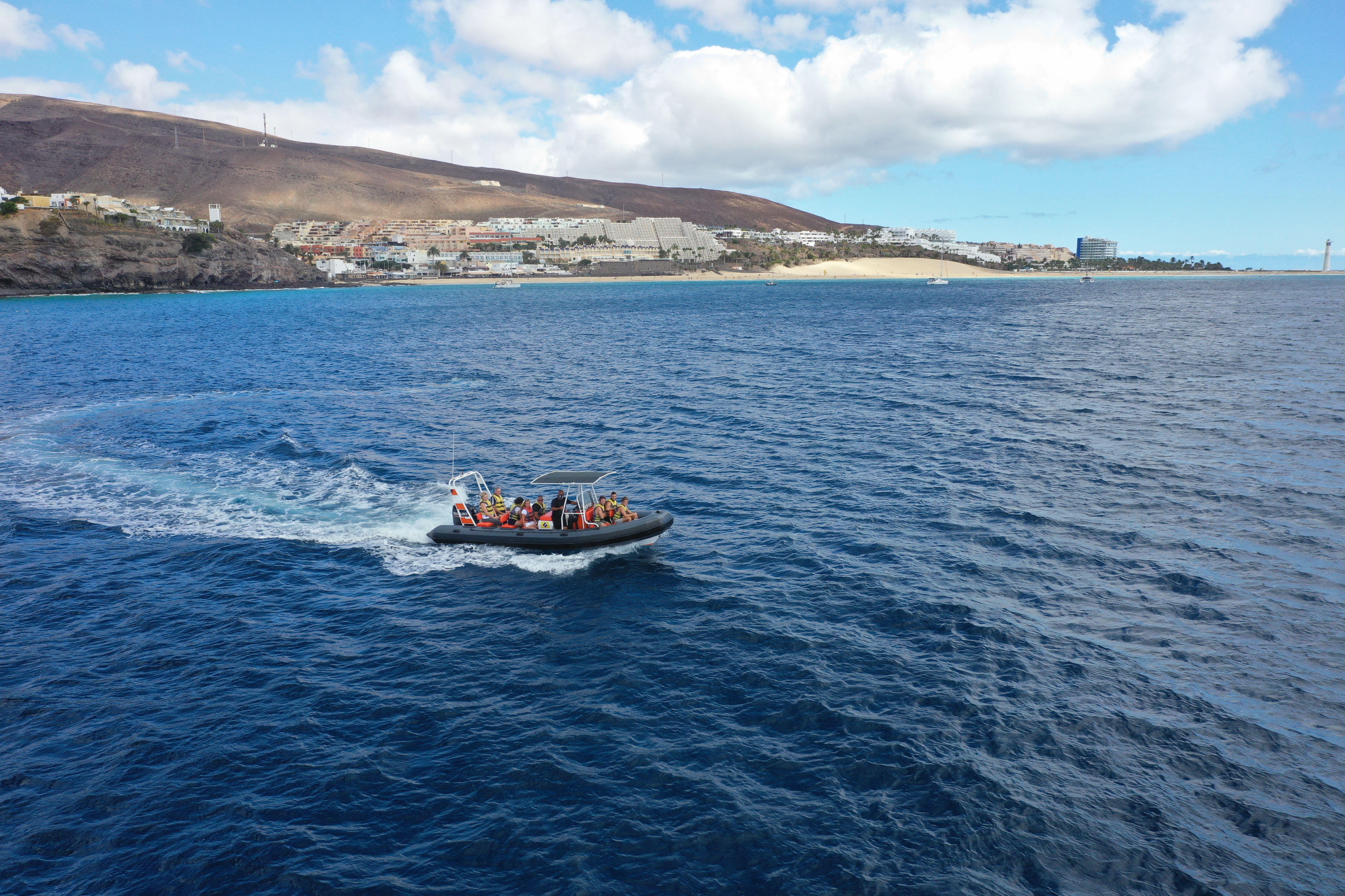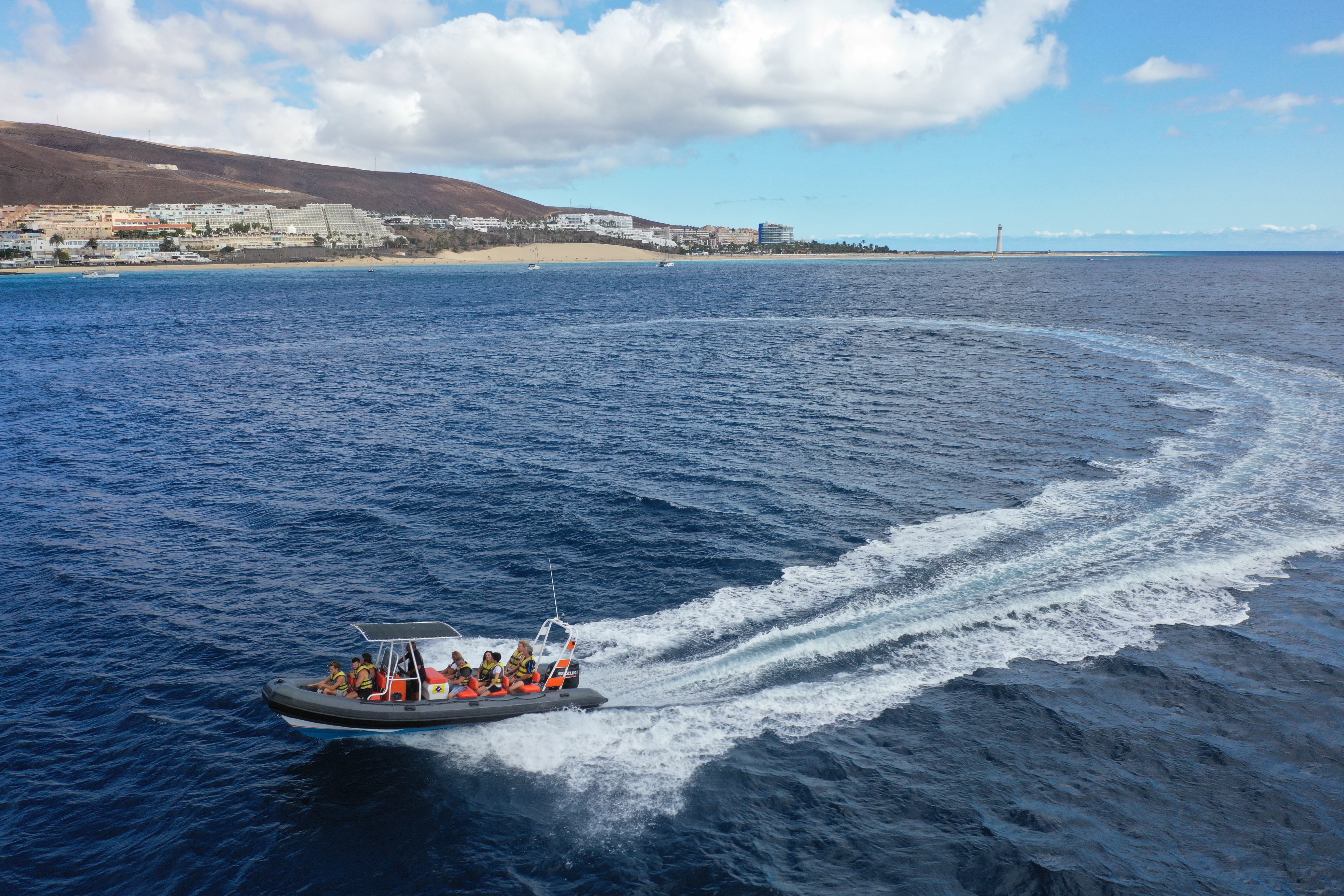Subiremos a una lancha semirrígida para dirigirnos hacia el Parque Natural de Jandía, una de las mejores zonas de Canarias para avistar delfines y ballenas. Los avistamientos son frecuentes durante todo el año, y tu guía compartirá información fascinante sobre las especies que puedas encontrar.