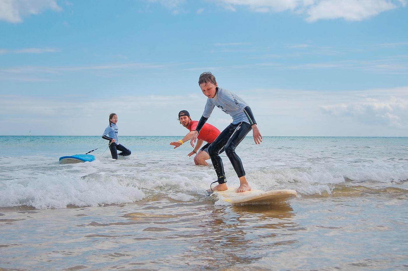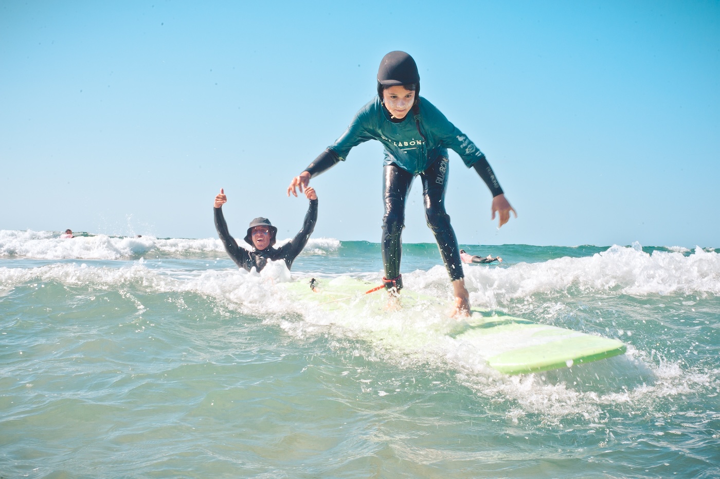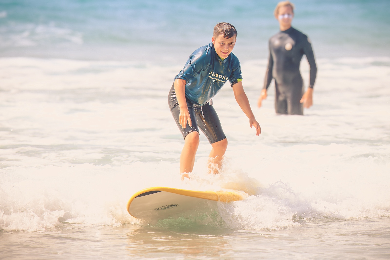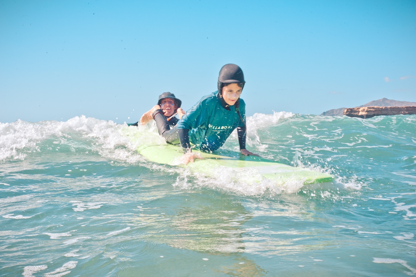 Nuestros instructores se sorprenden constantemente de lo rápido que los niños aprenden de forma natural. Ver su entusiasmo y emoción al subirse a una ola es casi tan gratificante como surfear. Contamos con un equipo de instructores que hablan alemán, inglés y español, y trabajamos con grupos reducidos para garantizar que los más pequeños reciban el apoyo necesario y una atención totalmente personalizada. Los instructores ayudan a los niños a llevar las tablas, elegir las olas adecuadas y empujar las tablas suavemente, ofreciendo comentarios y apoyo constante.