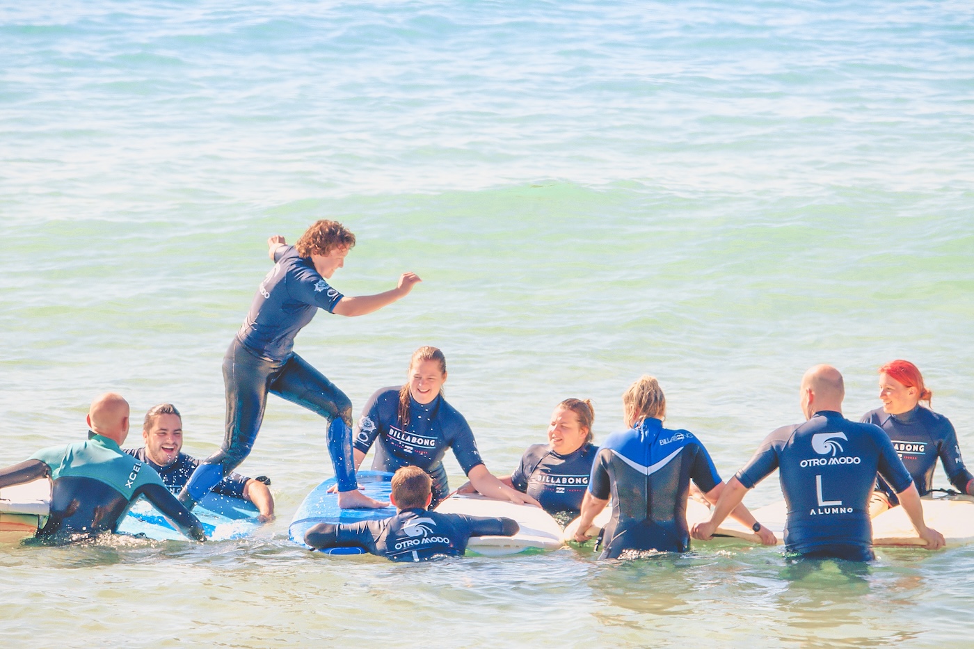 Al llegar a la playa, los instructores explican el uso del equipo de surf, las características de las olas, las corrientes y las normas de seguridad. Tras una breve introducción teórica, los niños realizan ejercicios prácticos en la arena. El instructor muestra la postura correcta en la tabla y el movimiento necesario para levantarse, conocido como “take off”. Este método garantiza que los niños adquieran confianza y seguridad en el agua desde el principio, aprendan a elegir las olas correctas y mejoren su técnica de surf.