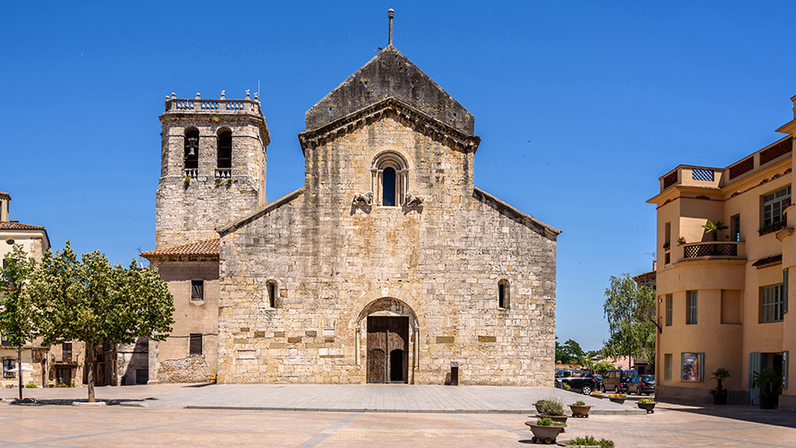 Esta robusta iglesia románica es lo único que aún se mantiene en pie del antiguo monasterio de San Pedro, fundado en el año 977 por Miró II Bonfill, conde de Besalú y obispo de Girona. De planta basilical y tres naves –dentro de las cuales merece especial atención el deambulatorio–, es la iglesia más importante de las tres que hay en la villa.