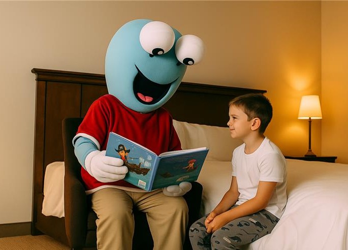Barcy, la entrañable mascota de Barceló, visita la habitación para acompañar a los más pequeños en su rutina antes de dormir. Durante esta visita, les leerá un cuento lleno de fantasía, los arropará con cariño y les dejará un peluche de regalo como recuerdo de una noche especial.