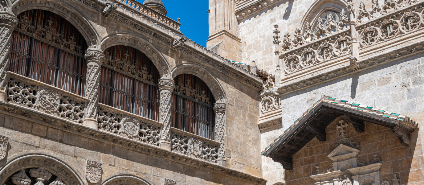 Cuando se construyó, la Capilla Real fue concebida para formar parte de la futura Catedral de Granada, que no comenzaría a levantarse hasta 1523. Eso explica que, en la actualidad, el templo esté encajonado entre la Catedral, la antigua Lonja y la iglesia del Sagrario –cuatro edificios ubicados donde antes se encontraba la Mezquita Mayor-, y que solo exhiba una fachada exterior. El contraste entre los sobrios muros lisos y la rica ornamentación de sus pináculos, cresterías, bóvedas y la portada plateresca es el mejor ejemplo del estilo gótico tardío o isabelino del monumento, un Protorrenacimiento que también se deja sentir en la decoración interior, donde también encontramos algunas esculturas barrocas.