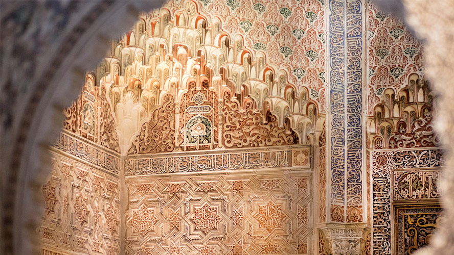 En la actual calle Oficios, junto al mercado de la Alcaicería y la ya desparecida Mezquita Mayor, una bella portada de mármol dio acceso desde 1349 al interior de la Madraza, con la que el sultán Yusuf I, que fue un apasionado de las ciencias y las artes, quiso convertir a Granada en un faro de luz y saber en la oscura Edad Media. Hoy, de aquella portada solo quedan algunos restos en el Museo Arqueológico de Granada, y la entrada, como el resto de la fachada, ha cambiado y es de estilo barroco. Dentro, sin embargo, quedan algunos vestigios de cómo fue la universidad árabe de Granada. Y la imaginación nos permite imaginar el resto.