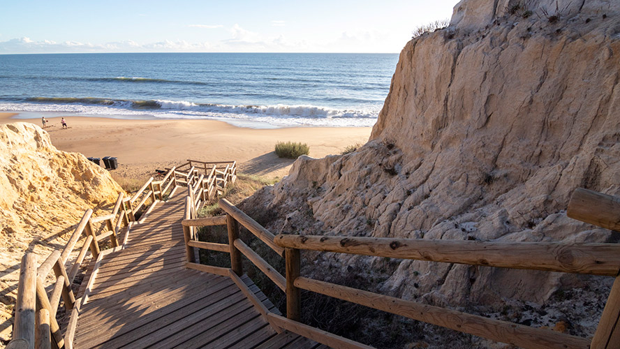Por tanto, es fácil entender que se trata de una de las playas más espectaculares no solo de la provincia de Huelva, sino de todo el país. Está protegida por un acantilado arenoso completamente cubierto de pinares y la orilla la bate la fuerza del Atlántico. Por eso, conviene bañarse con precaución y no confiarse, pues puede haber corrientes submarinas que no se vean a simple vista.