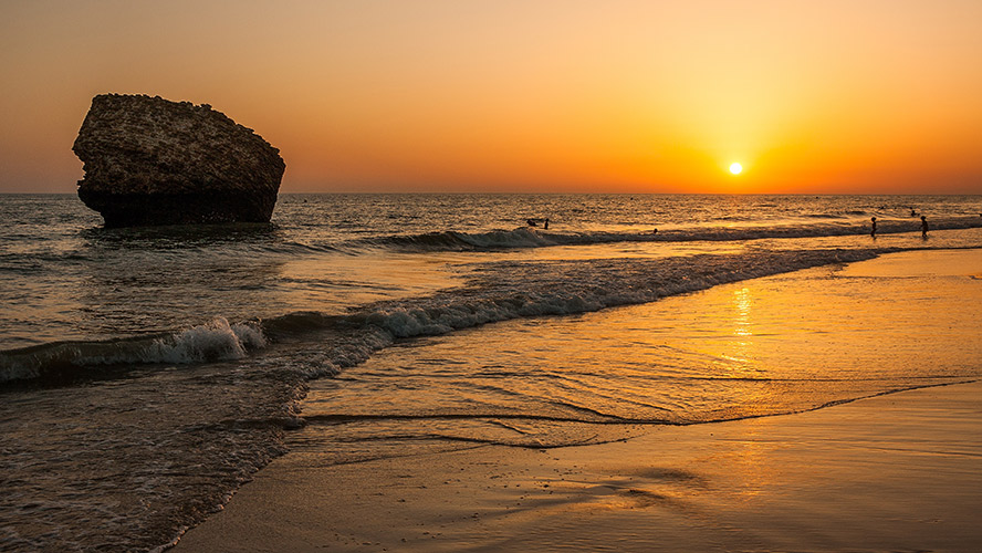 Del extremo occidental de la costa de Huelva, al oriental. El Parque Nacional de Doñana, joya natural de España, se asoma al mar en la playa de Matalascañas. Esta enorme y rectilínea playa de más de cuatro kilómetros es uno de los principales puntos turísticos de veraneo en la costa atlántica andaluza. Su extensión impide que el arenal se masifique y todavía sea posible encontrar sitio fácilmente.
