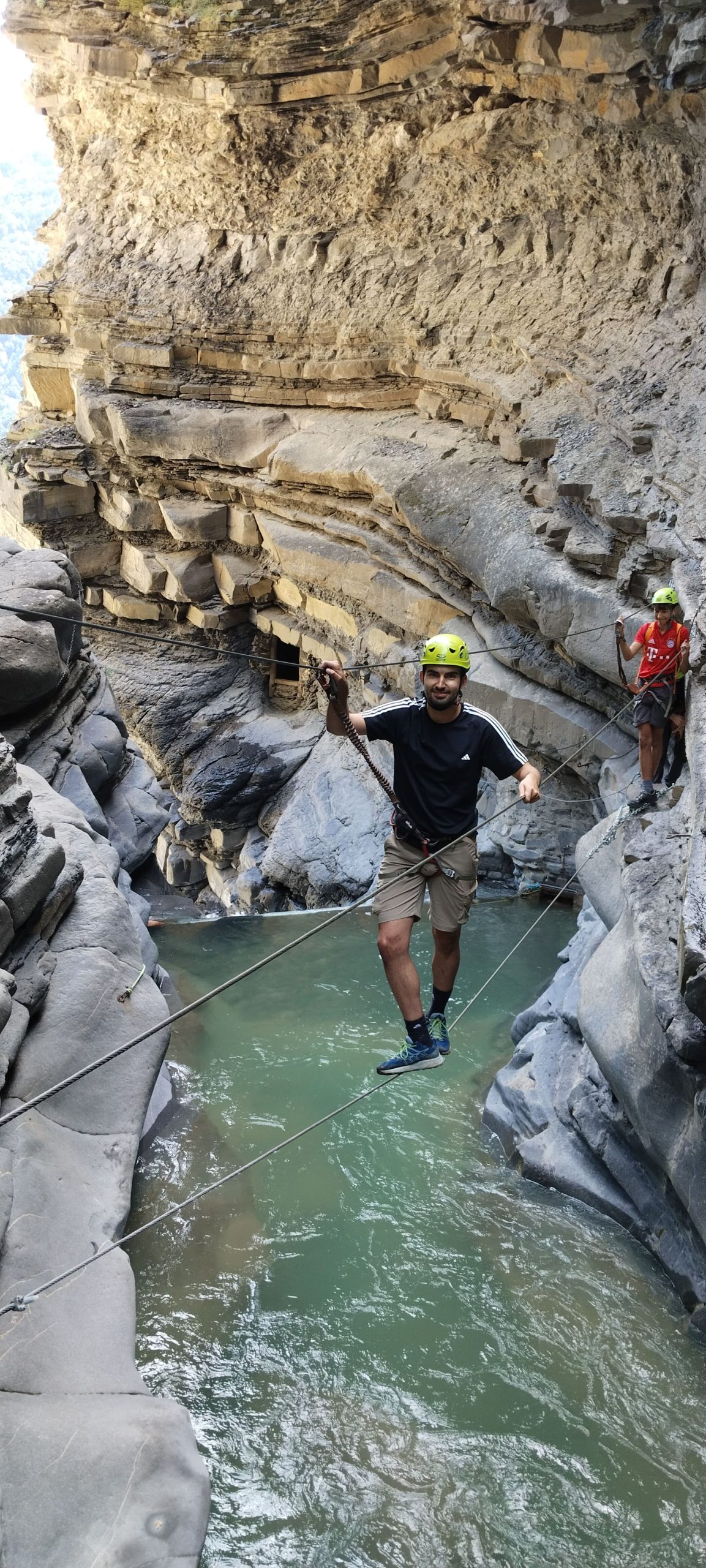 Realizaremos primero la via ferrata. Es una espectacular vía ferrata, que remonta en su inicio junto a dos espectaculares cascadas, de unos 100 metros de desnivel.